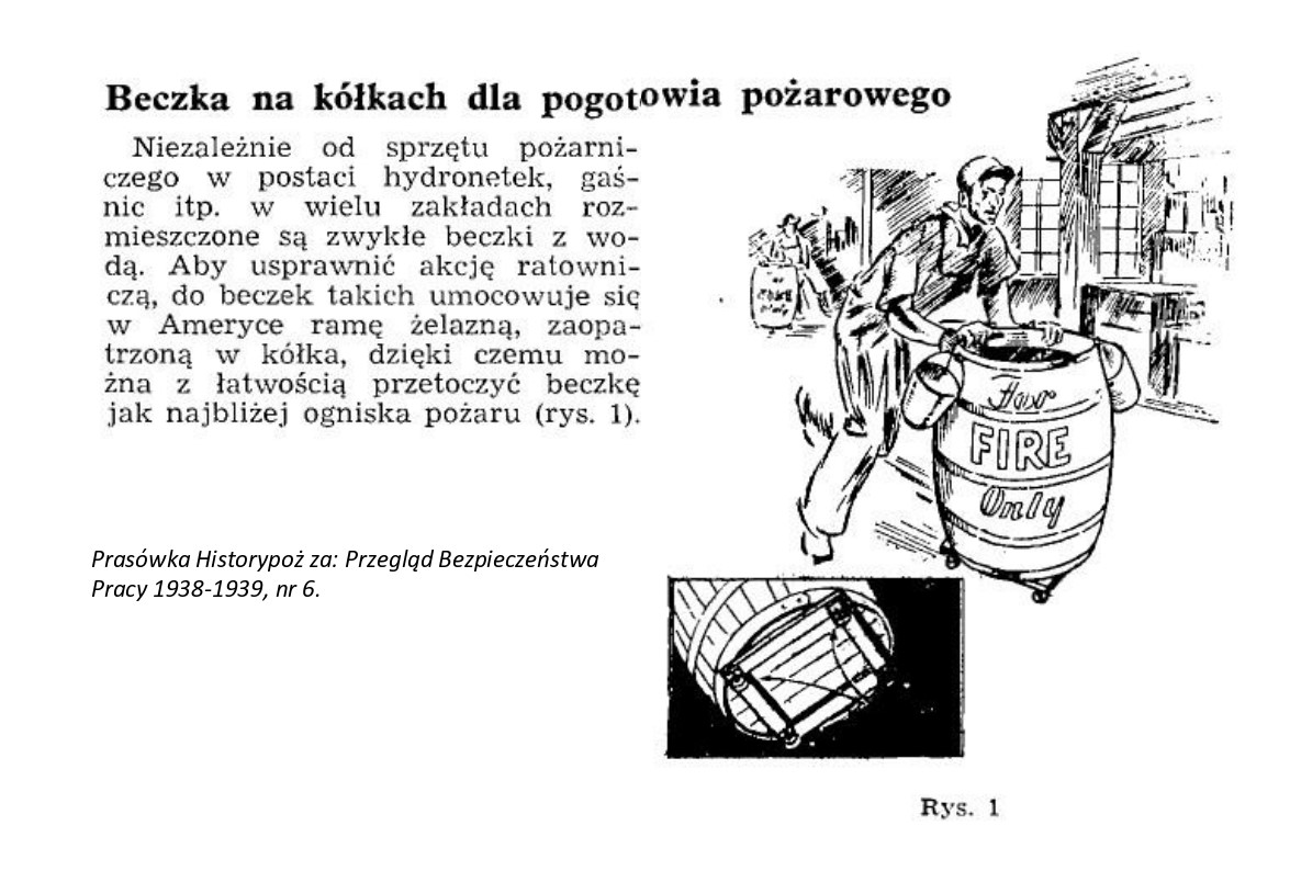 Beczka na kółkach dla pogotowia pożarowego, to tytuł prasówki z 1939 r. „Niezależnie od sprzętu pożarniczego w postaci hydronetek, gaśnic itp. w wielu zakładach rozmieszczone są zwykłe beczki z wodą.” Tymczasem w Stanach Zjednoczonych ... Zobacz obraz w multimediach zajawki i przeczytaj o jakich rozwiązaniach napisano w czasopiśmie „Przegląd Bezpieczeństwa Pracy”, nr 6 z 1939 r.