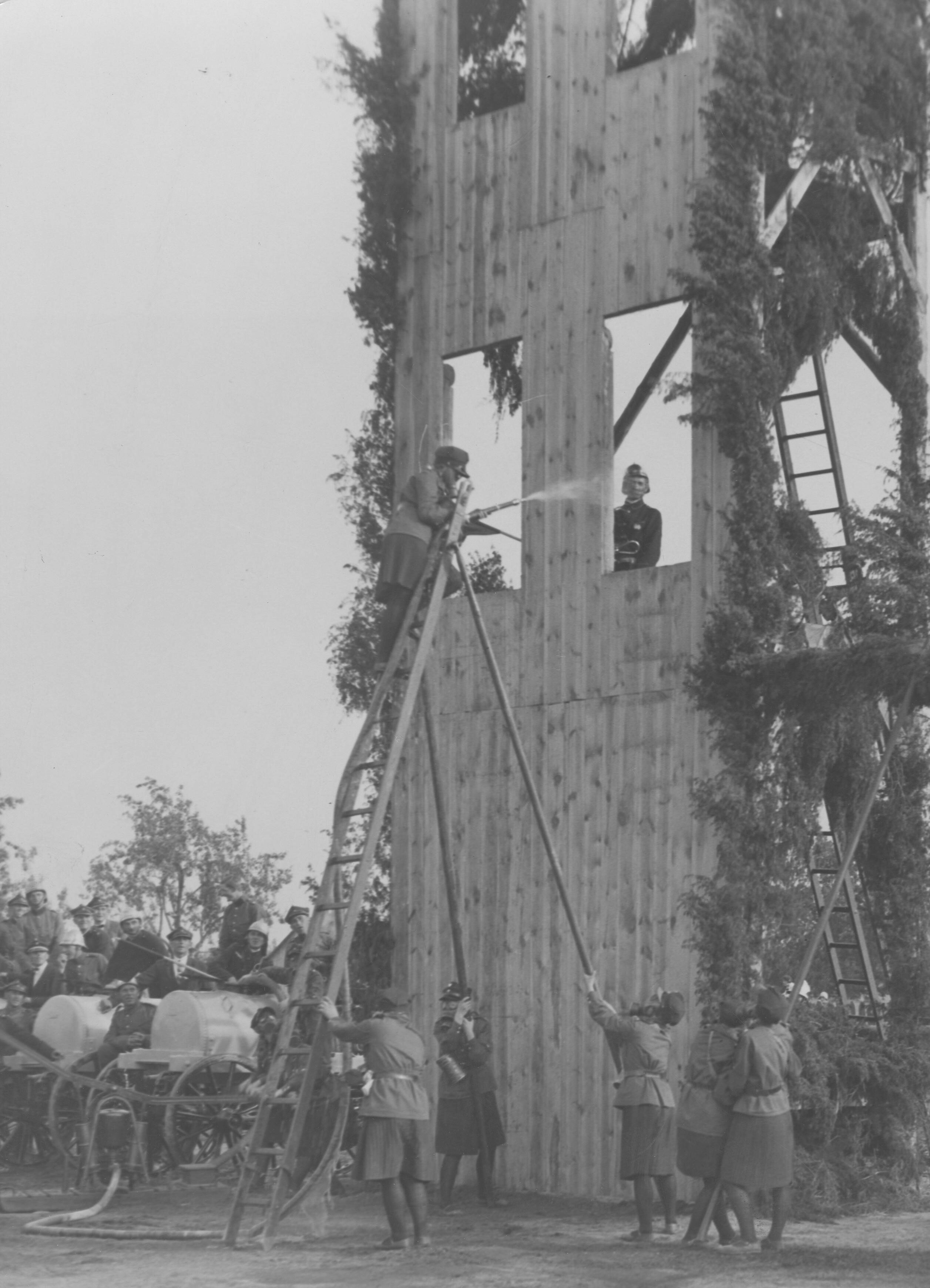 Ćwiczenia zastępu żeńskiej straży pożarnej w Gostyninie. Polska lata 30.XX w. Na ujęciu strażaczki na i przy wspinalni. Niektóre z nich w maskach przeciwgazowych. W tle widoczne żeliwne beczkowozy na podwoziu czterokołowym i sikawka przenośna w działaniu. Ćwiczeniom przyglądają się inni strażacy. Fotografia ze zb. Narodowego Archiwum Cyfrowego, sygn. 3/1/0/8/6760.