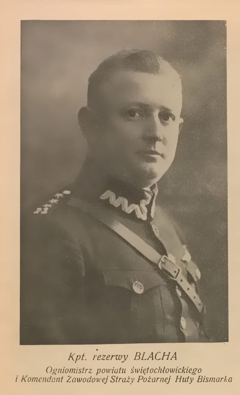 Cieszę się, kiedy przy okazji innych poszukiwań z zakresu historii pożarnictwa nadal natrafiam na informacje o nim oraz na zdjęcia takie jak to w multimediach zajawki. Zdjęcie, które macie okazję zobaczyć pochodzi z 1931 roku. Pod nim widnieje podpis: kpt. rezerwy Blacha. Ogniomistrz powiatu świętochłowickiego i komendant Zawodowej Straży Pożarnej Huty Bismarka.