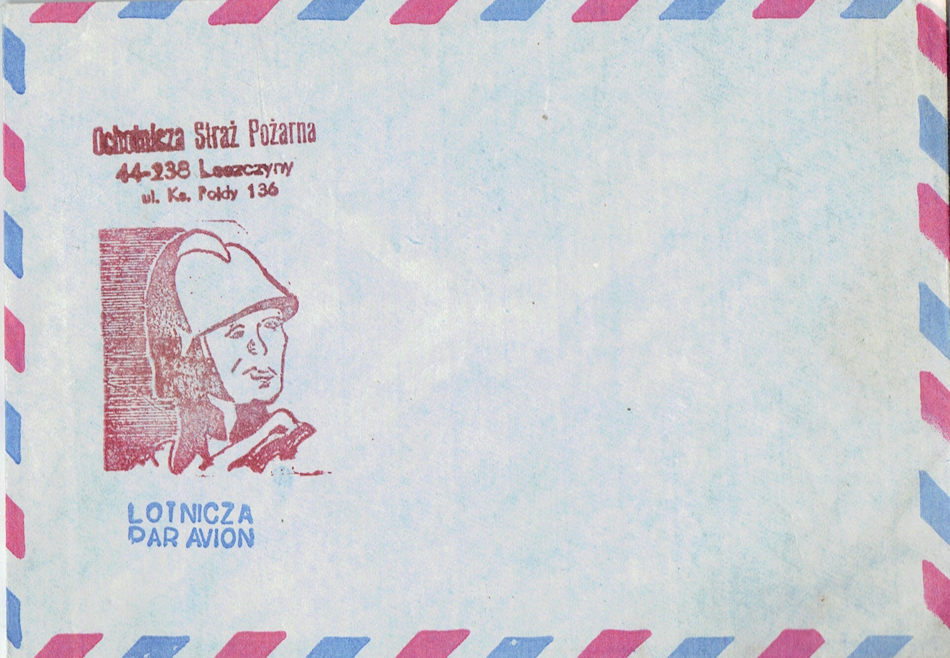 Koperta kolekcjonerska poczty lotniczej z grafiką strażaka i napisem: Ochotnicza Straż Pożarna 44-238 Leszczyny, ul. ks. Pojdy 136. Polska, lata 80. XX w. Przyznajcie, że jest to gratka dla zbieraczy nie tylko wszelakich walorów strażackich.