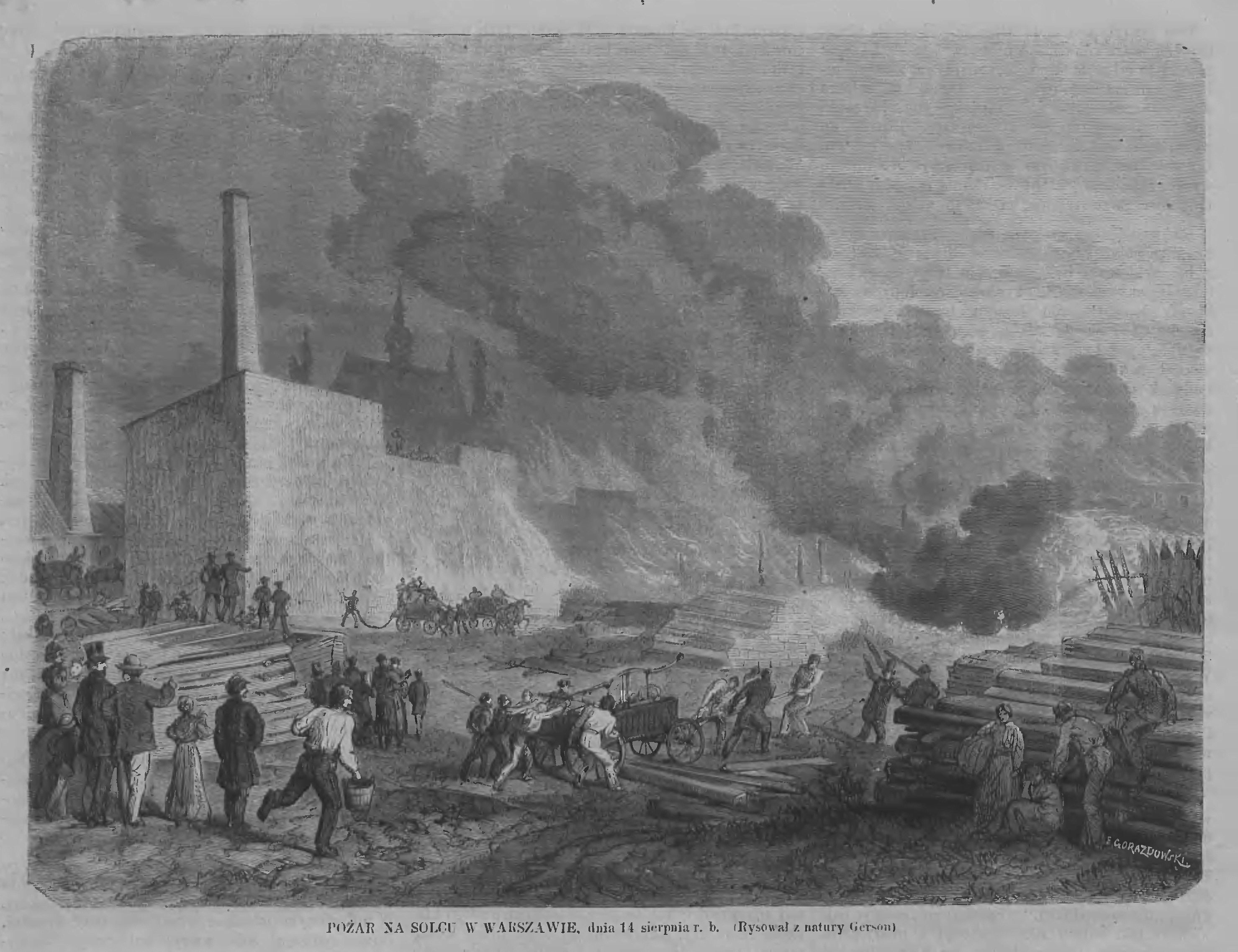 Literatura i przypis: za Tygodnik Ilustrowany nr 35 z 29 sierpnia 1868 r. W multimediach: grafika: Pożar na Solcu 14 sierpnia 1868 r. Twórcy: Rys. Wojciech Gerson. Ryt. Edward Gorazdowski.