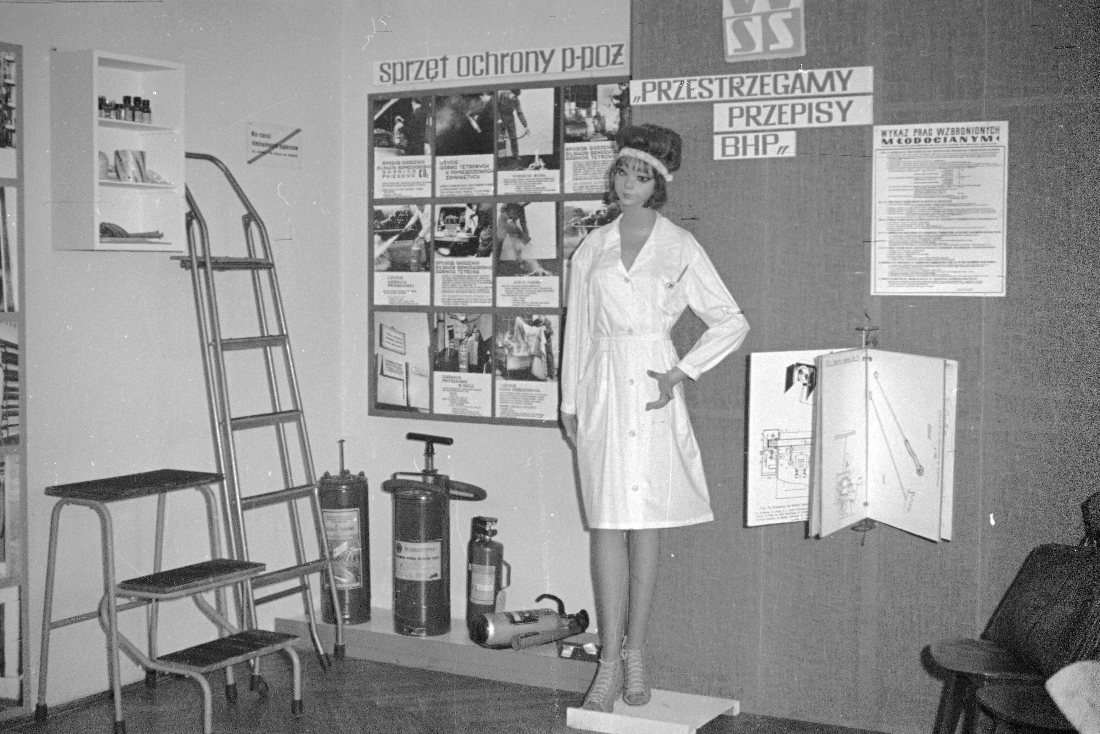 Fragment sali szkoleniowej. Widoczne plansze szkoleniowe zatytułowane: „Sprzęt ochrony p- poż”. Na ujęciu także apteczka, drabina i m.in. gaśnice w tym hydronetka. Szkolenie BHP odbyło się w Warszawskiej Spółdzielni Spożywców Społem Oddział Praga.