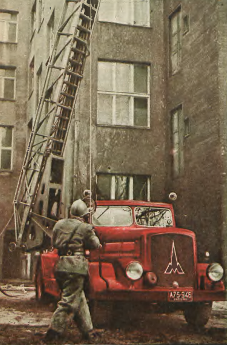 Więcej na temat sprzętu z lat 50. użytkowanego przez zawodową straż pożarną z Warszawy przeczytacie na łamach czasopisma Stolica - warszawski tygodnik ilustrowany. R. 10, 1955 nr 15.