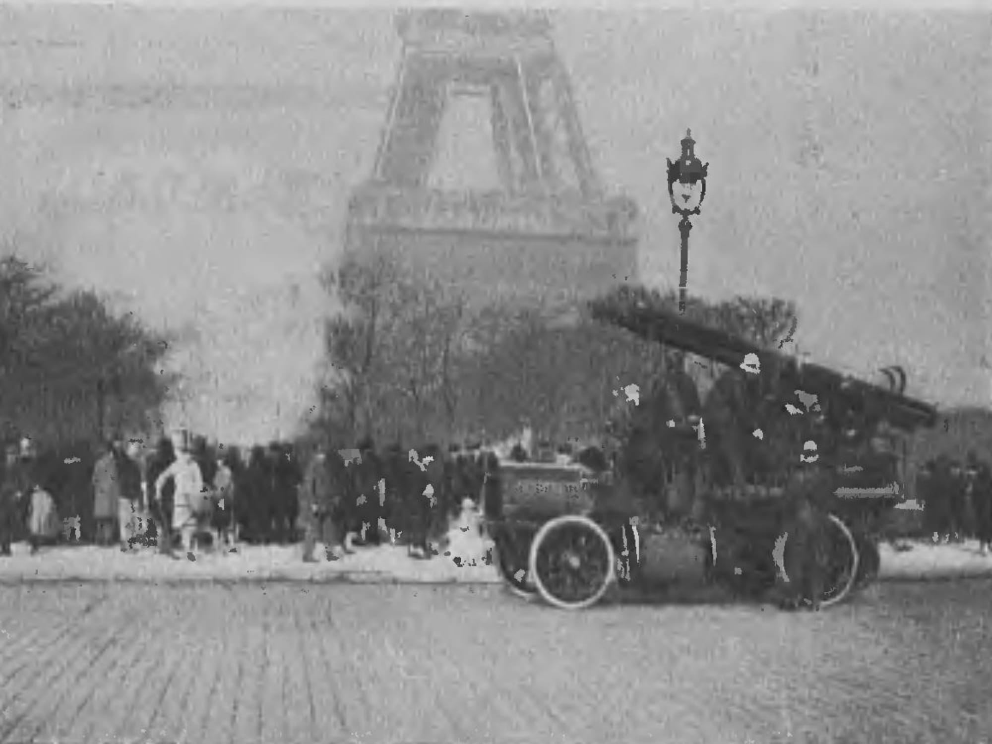 Fotografia z 1926 r. przedstawia paryską straż pożarną pod wieżą Eiffla. Dokument wizualny opublikowany został na łamach Tygodnika Ilustrowanego w numerze 11 z 13 marca 1926 r. i podpisany jako: Przybycie straży ogniowej na miejsce katastrofy lotniczej pod wieżą Eiffla. Fot. Meurisse.