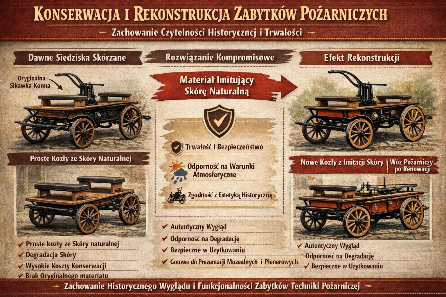 Czasami można jeszcze spotkać w remizach i muzeach zabytkowe sikawki konne i wozy konne rekwizytowe, które na wyposażeniu posiadają siedziska (kozły) obite jeszcze naturalną skórą. Skóra była materiałem powszechnie używanym ze względu na swoje właściwości użytkowe. Jak to wygląda współcześnie w ujęciu konserwacji i rekonstrukcji tej materii? Naturalna skóra cechuje się ograniczoną trwałością w warunkach zmiennej wilgotności i temperatury. Jest materiałem podatnym na degradację biologiczną. Jej regularna konserwacja jest kosztowna i trudna w długim okresie ekspozycji. W przypadku rekonstrukcji brak jest oryginalnego materiału, co wyklucza zachowanie autentycznej substancji.