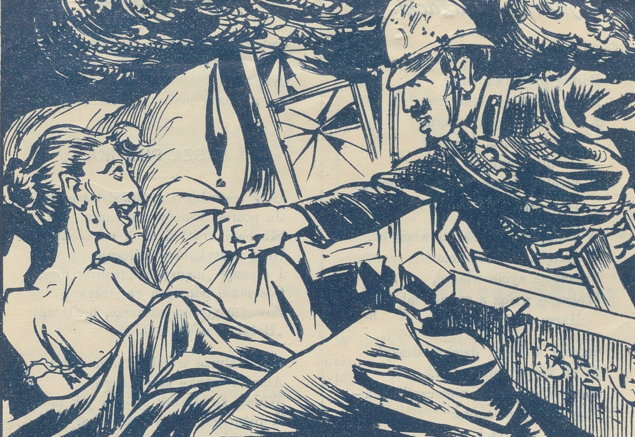 Stara panna nagle zbudzona: Ach co za śliczny chłopiec! O mój luby chcesz mnie wykraść zapewne… Strażak wywaliwszy okno pięścią: Nie zawracaj panna głowy z amorami, tylko wstawaj prędzej bo się pali!