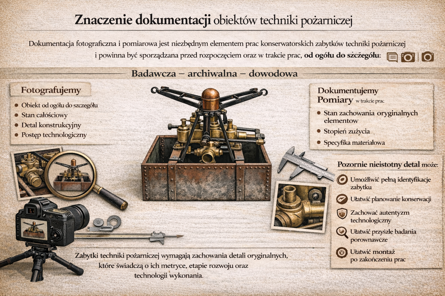 Szczególne znaczenie ma dokumentowanie pozornie nieistotnych detali konstrukcyjnych, takich jak: kształt i sposób wykonania okuć, połączeń, gwintów, zaworów czy elementów napędowych. Detale te mogą stanowić kluczowe źródło informacji umożliwiające właściwą identyfikację obiektu pod względem kryterium metrykalnego, rozwoju techniki pożarniczej, warsztatu wykonawczego lub etapu postępu technologicznego.
