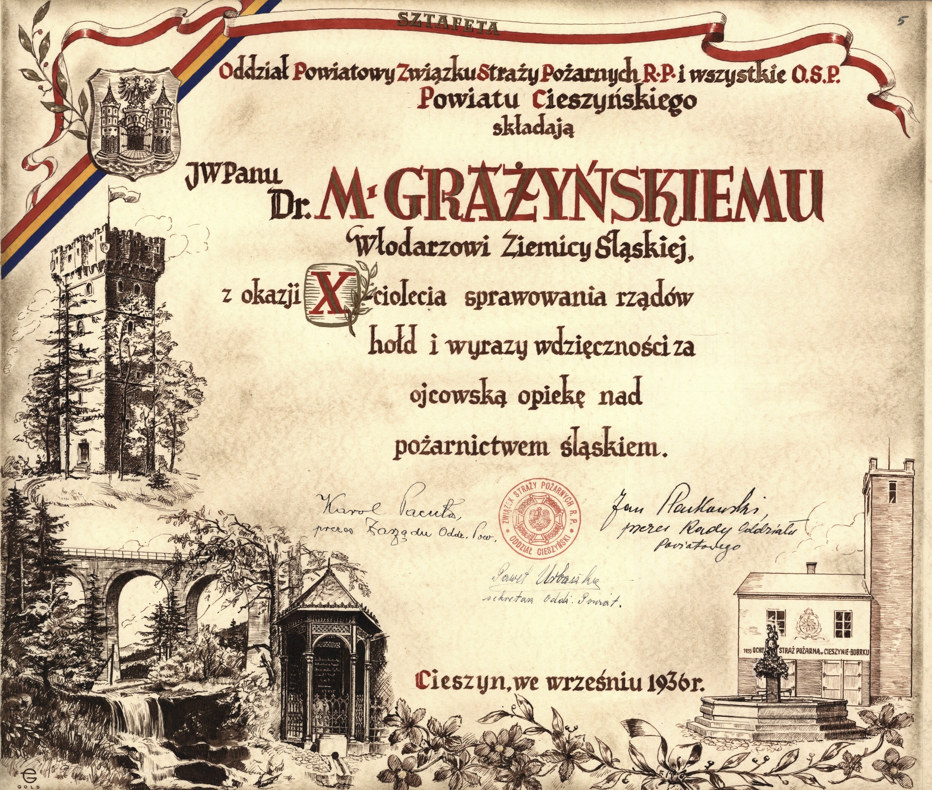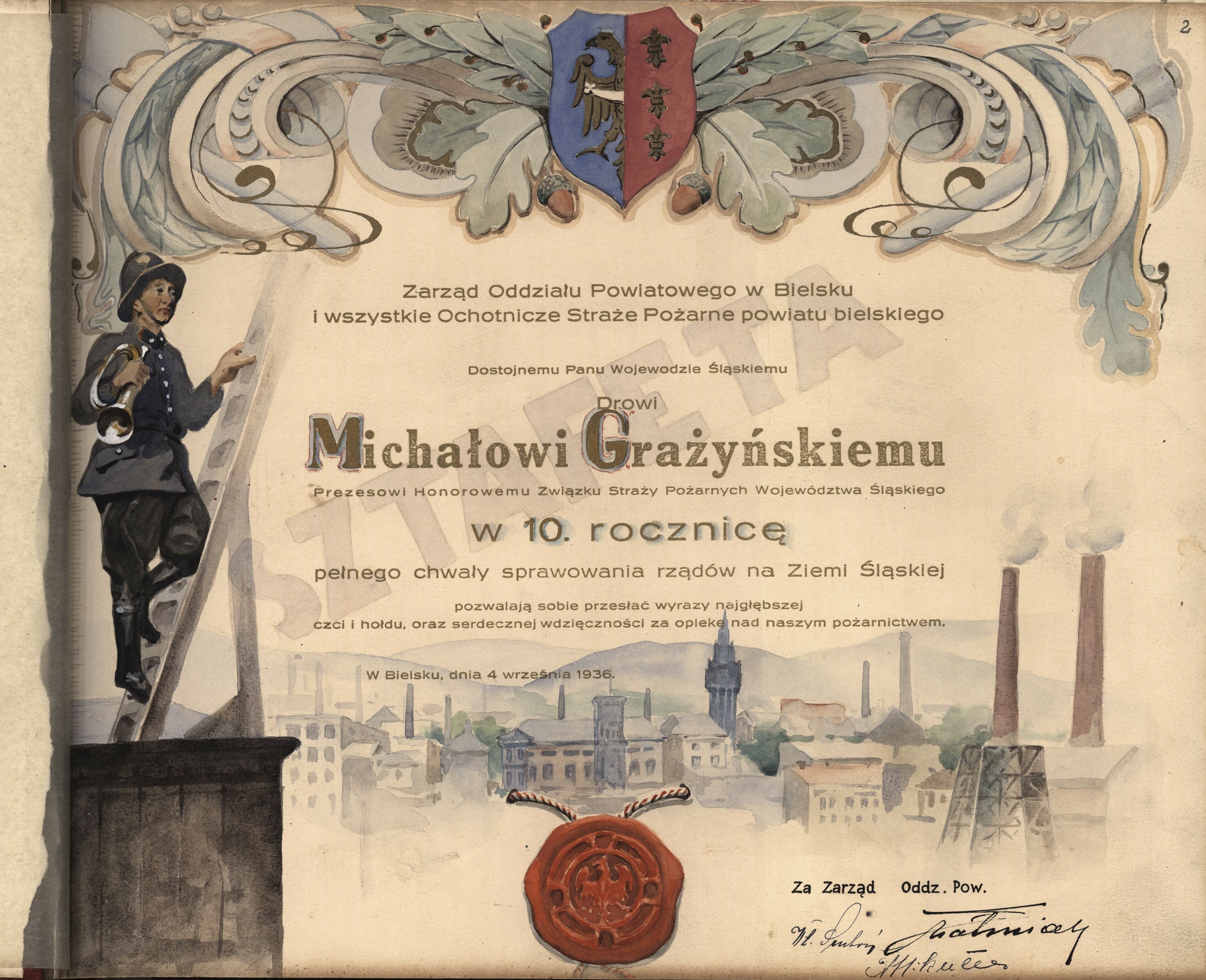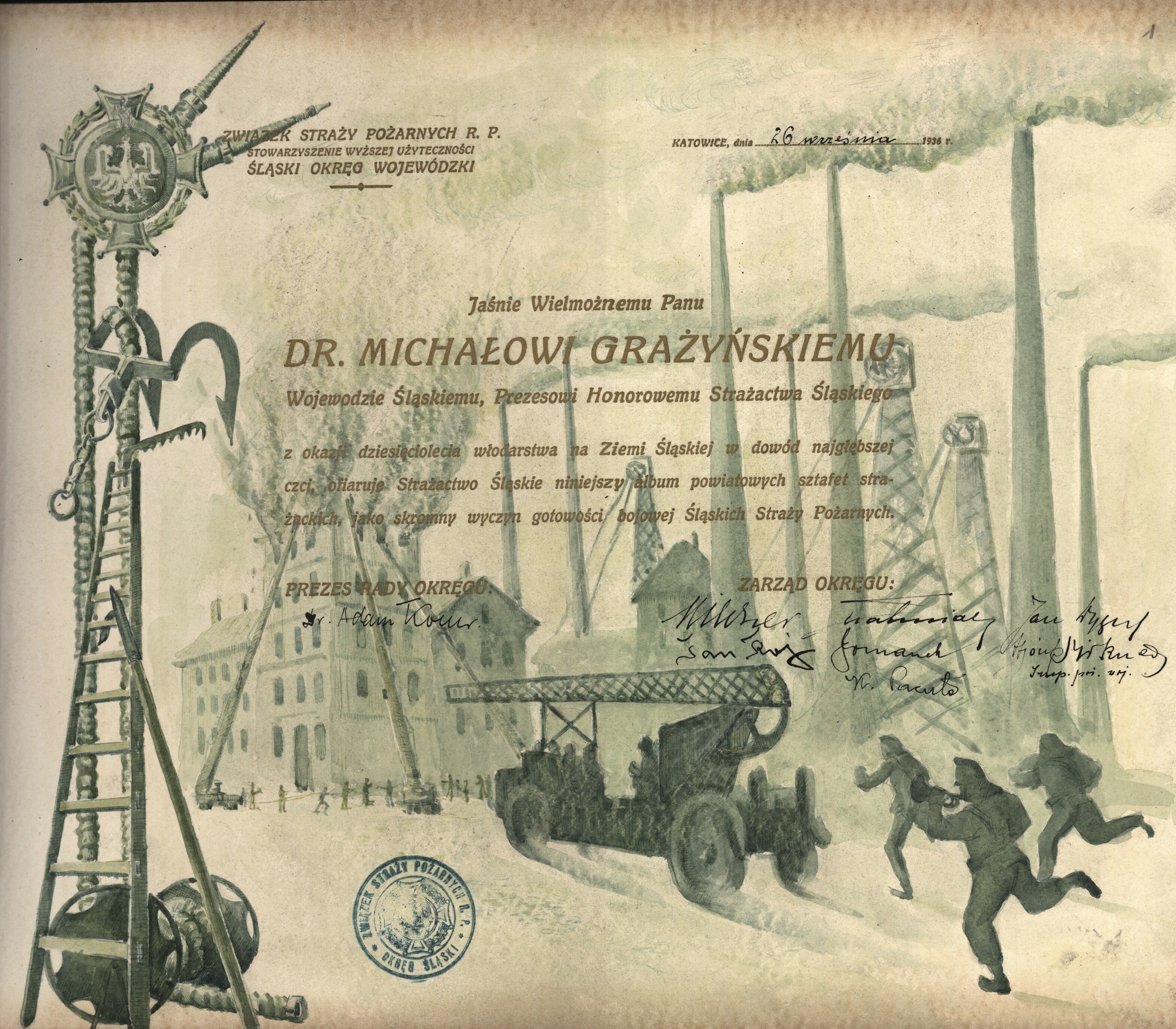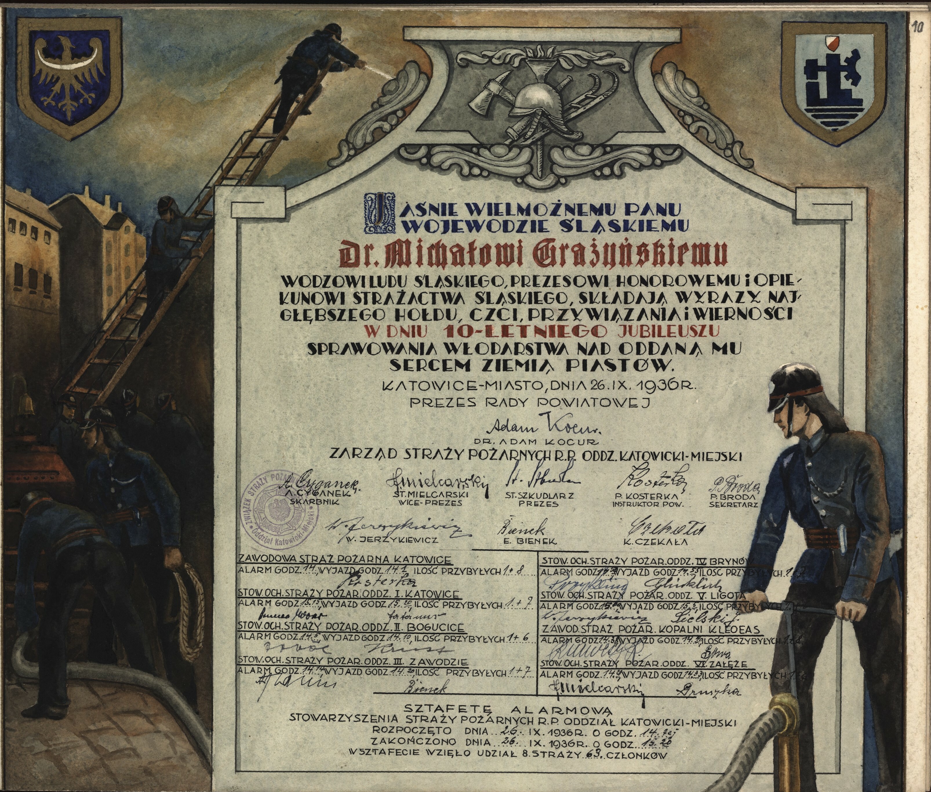 Kilka dni temu na podstronie Poż Show Gallery zaprezentowałam kilka kart z barwnego albumu hołdowniczego Okręgu Śląskiego Związku Straży Pożarnych, dedykowanego prezesowi honorowemu strażactwa śląskiego M. Grażyńskiemu w 1936 r. Przypominam, że dokument ten znajduje się w zbiorach Archiwum Państwowego w Katowicach syg. 12/27/0/1/381, oprawa twarda, okładka przesznurowana.