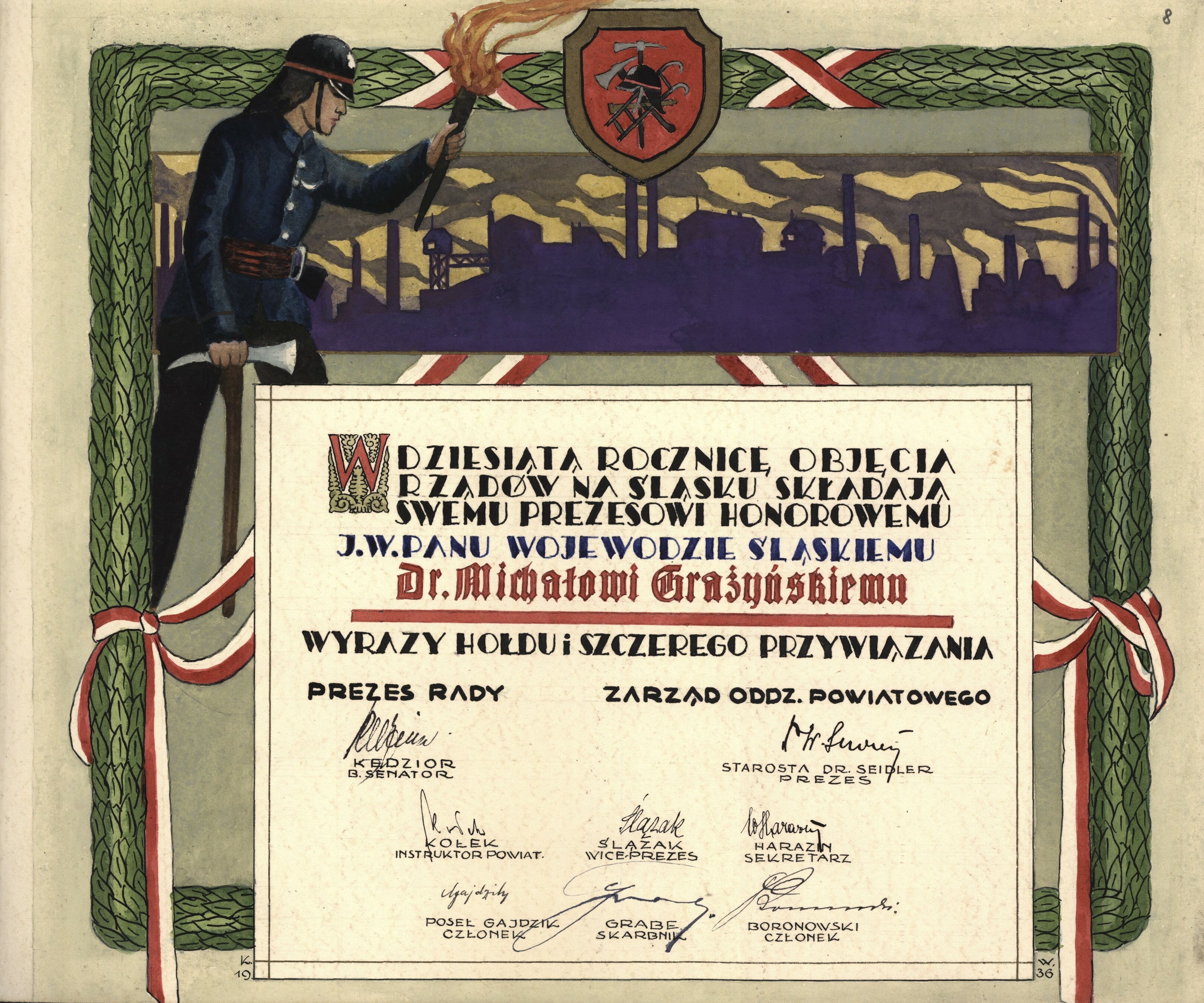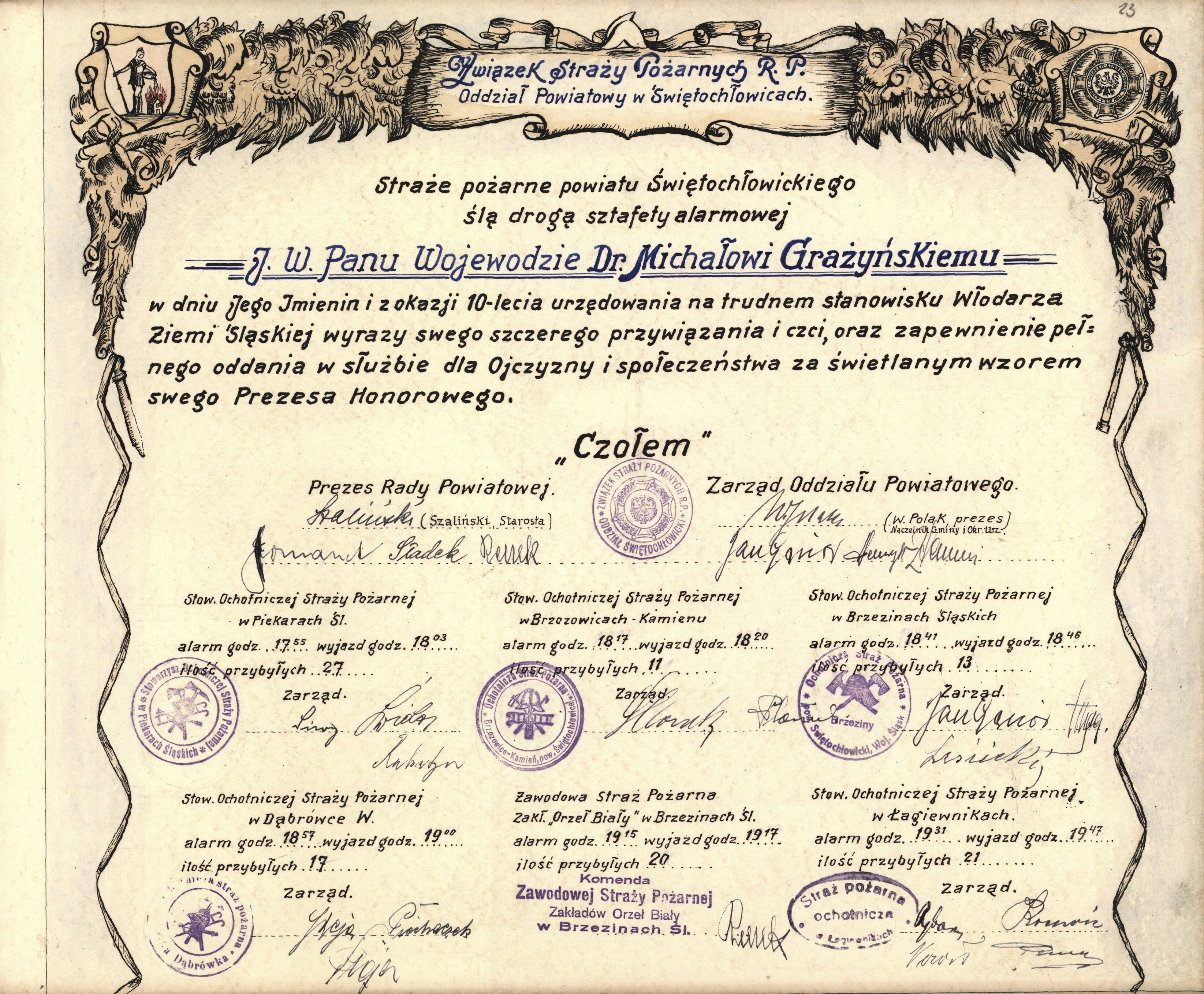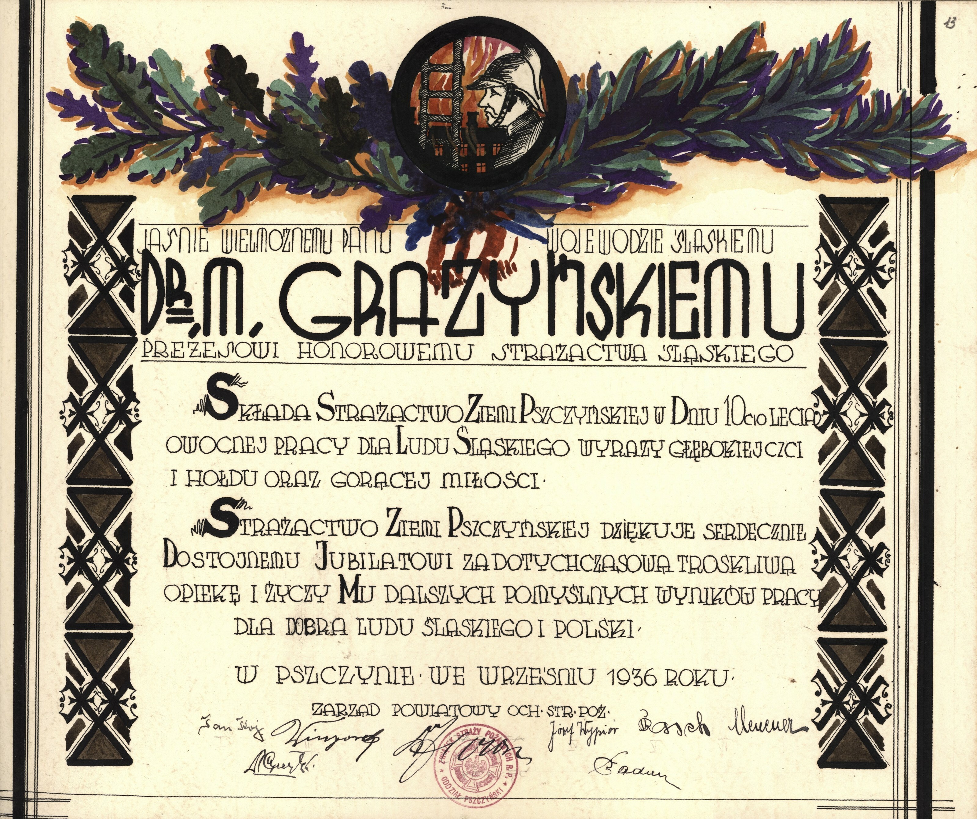 Kilka dni temu na podstronie Poż Show Gallery zaprezentowałam kilka kart z barwnego albumu hołdowniczego Okręgu Śląskiego Związku Straży Pożarnych, dedykowanego prezesowi honorowemu strażactwa śląskiego M. Grażyńskiemu w 1936 r. Przypominam, że dokument ten znajduje się w zbiorach Archiwum Państwowego w Katowicach syg. 12/27/0/1/381, oprawa twarda, okładka przesznurowana.