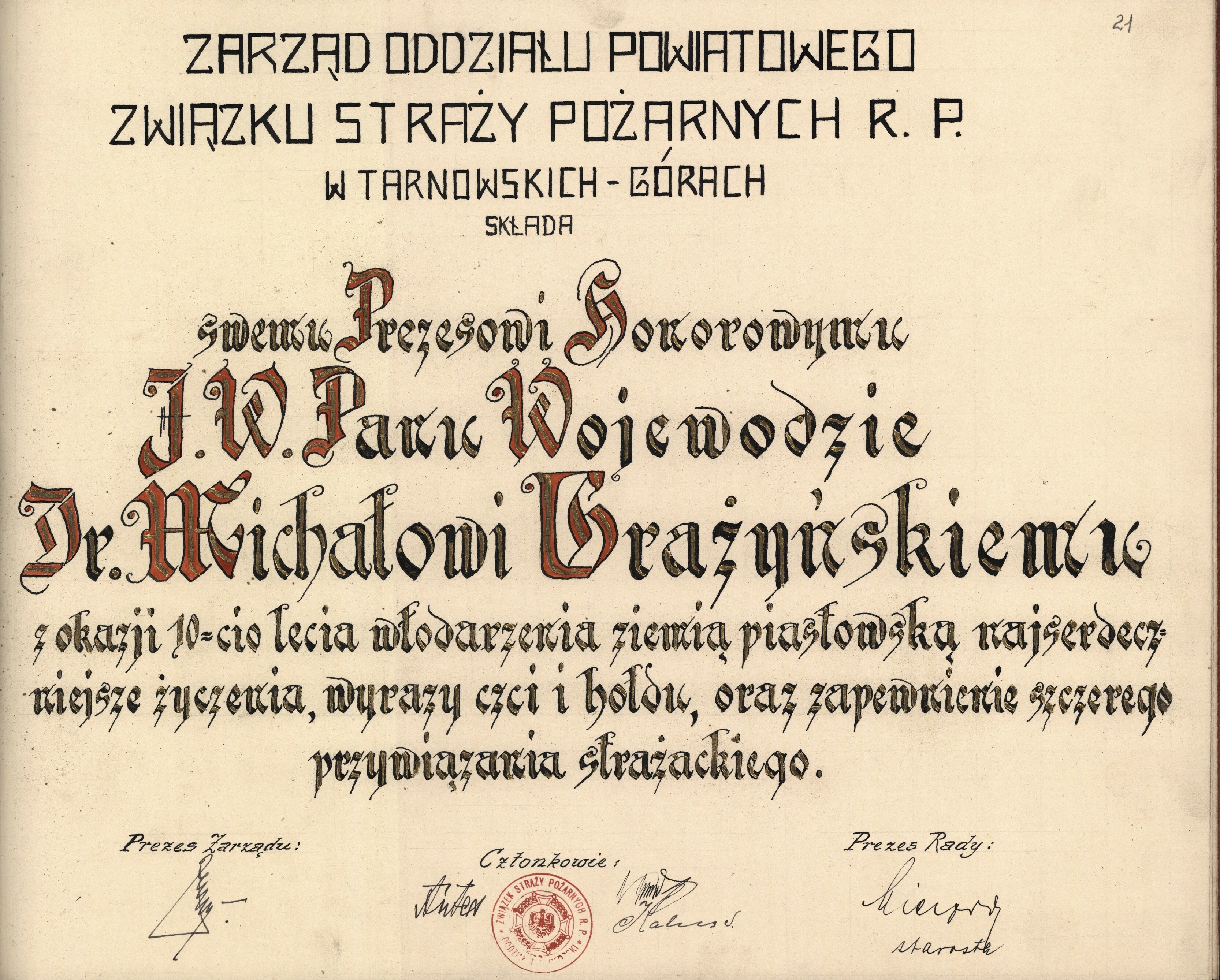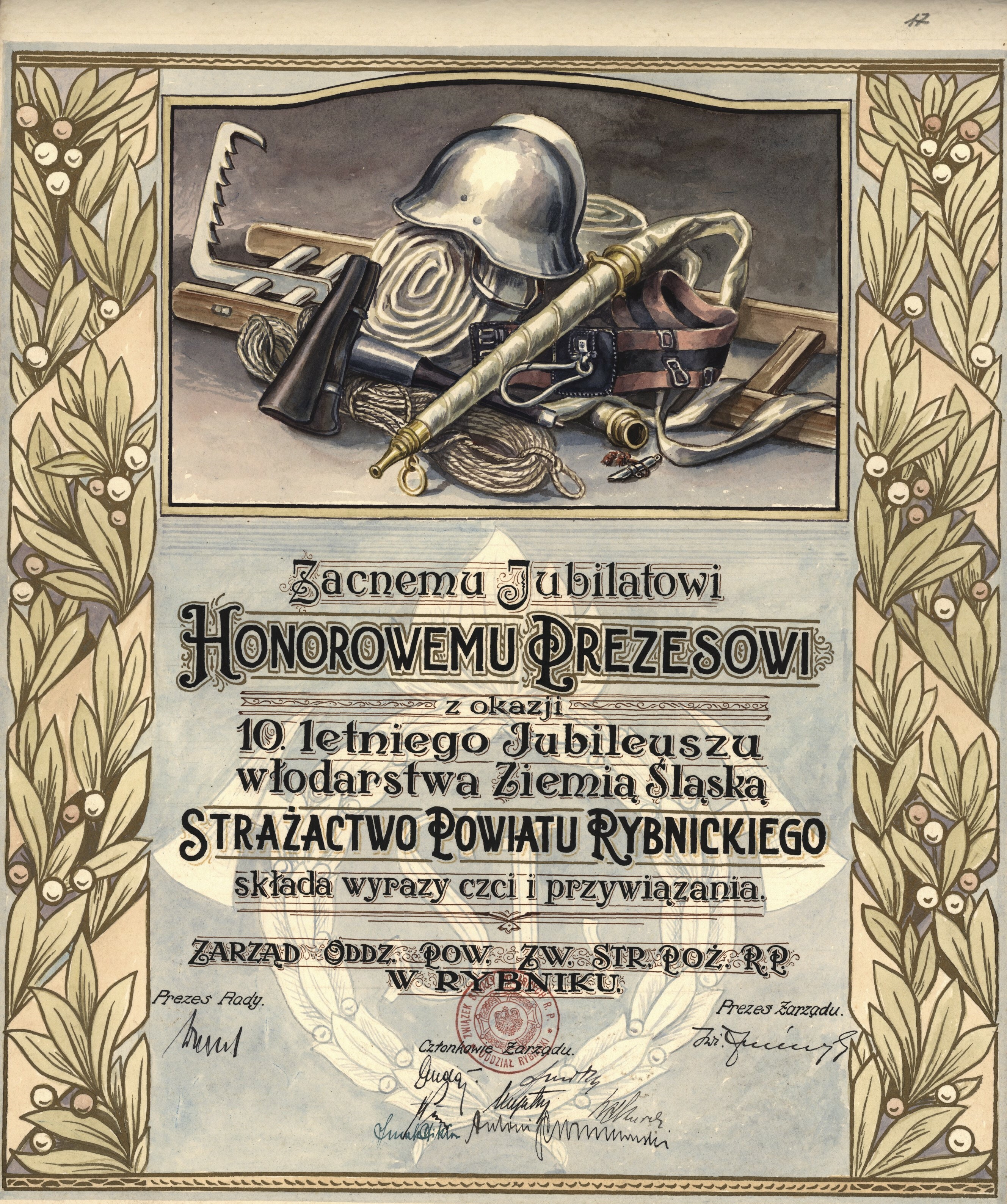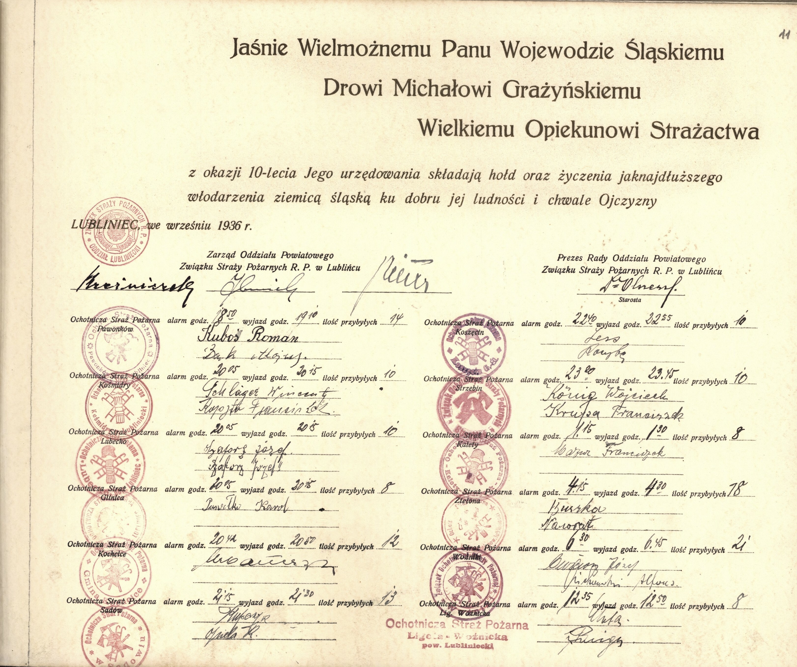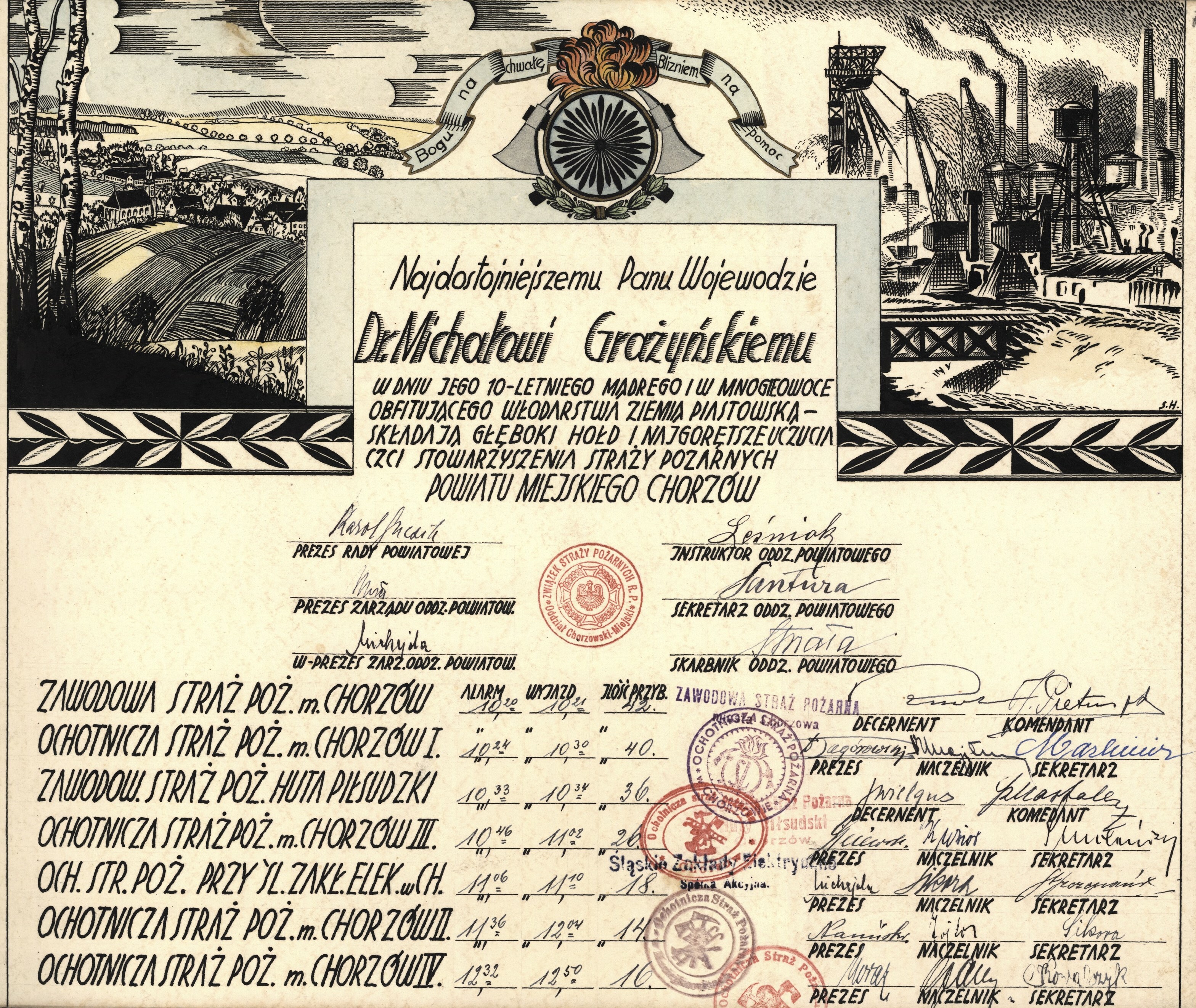 Kilka dni temu na podstronie Poż Show Gallery zaprezentowałam kilka kart z barwnego albumu hołdowniczego Okręgu Śląskiego Związku Straży Pożarnych, dedykowanego prezesowi honorowemu strażactwa śląskiego M. Grażyńskiemu w 1936 r. Przypominam, że dokument ten znajduje się w zbiorach Archiwum Państwowego w Katowicach syg. 12/27/0/1/381, oprawa twarda, okładka przesznurowana.