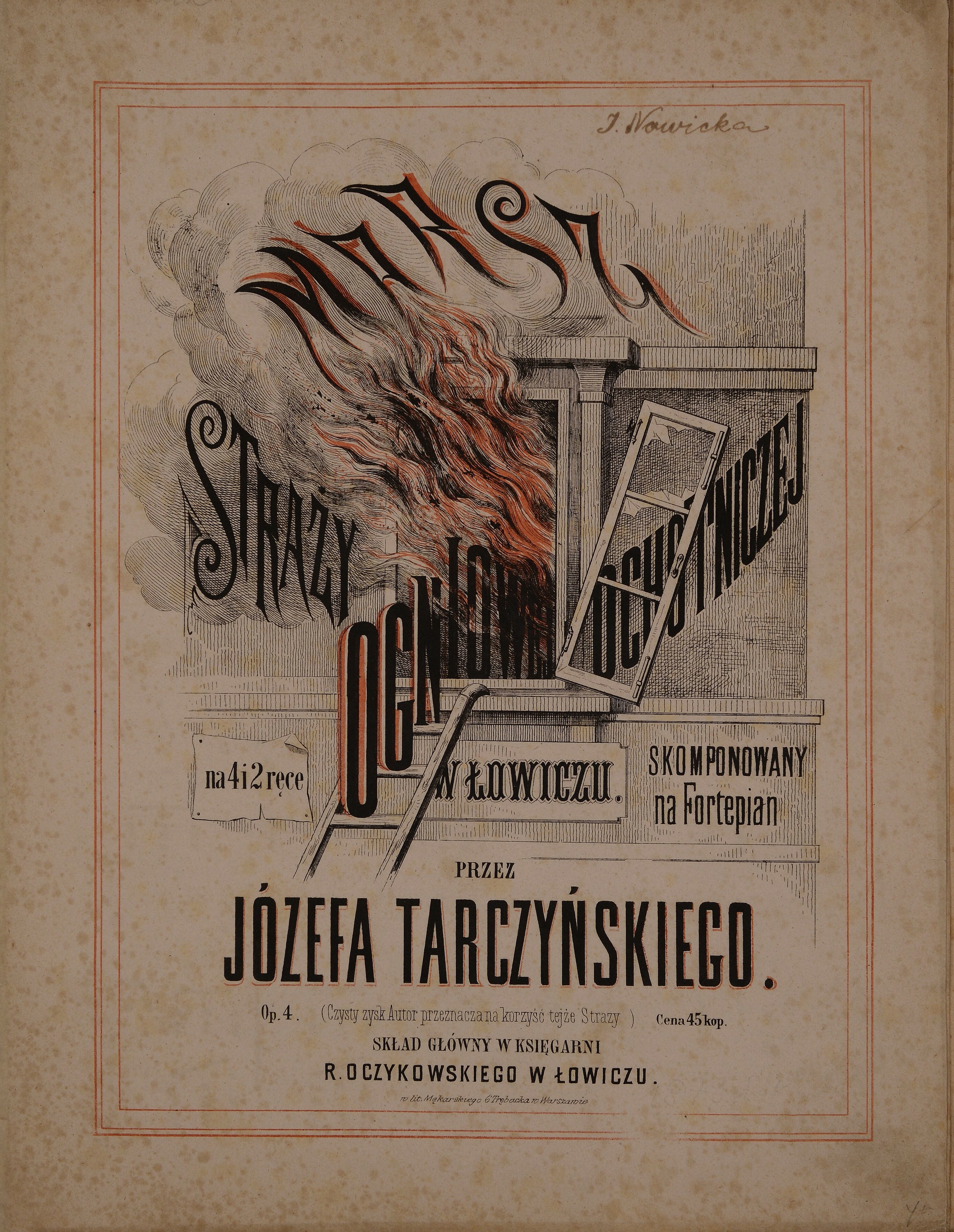W dzisiejszej zajawce okładka tytułowa druku muzycznego – marsz strażacki na fortepian Ochotniczej Straży Pożarnej z Łowicza. Utwór ten skomponowany został przez Józefa Tarczyńskiego i wydany 31 października 1879 r. (Zb. FBC – domena publiczna).