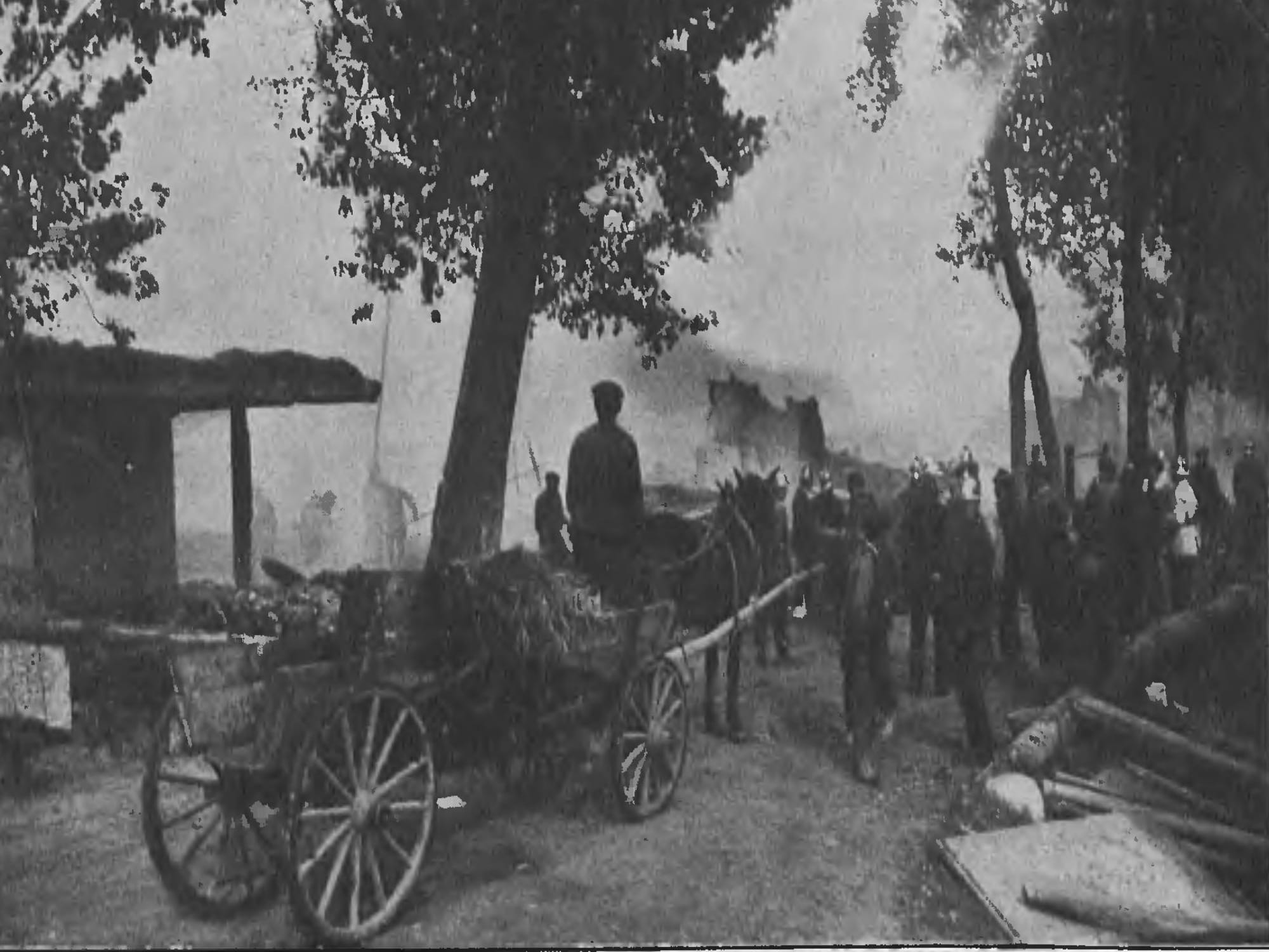 Pod Łowiczem pożar zniszczył kilkadziesiąt domów, fot. Pafot, 1926 r. Na fotografii ludność cywilna i strażacy. Niektórzy z nich porządkują teren po pożarze. W tle widoczne ruiny domostw.