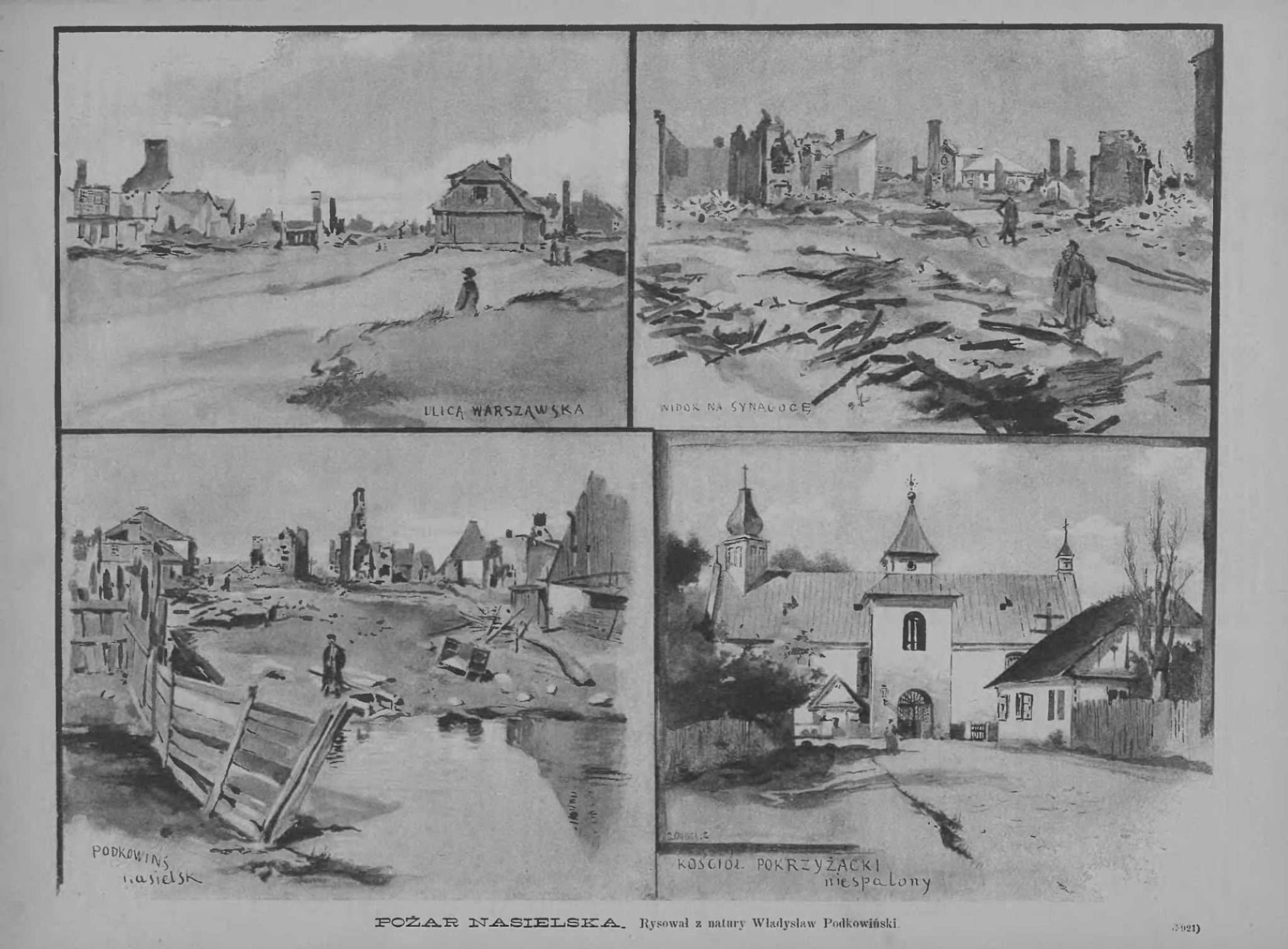 W Zajawce Poż udostępniam Wam cykl jego rysunków z pożaru Nasielska z 1891 r. Nie będzie zaskoczeniem jak nadmienię, że rysunki te ukazały się w Tygodniku Ilustrowanym, a artysta jak wielu, o których już też wspominałam w poprzednich zajawkach stworzył je z natury. „W nocy z 24 na 25 czerwca gwałtowny pożar obrócił w perzynę znaczną część miasteczka Nasielsk w powiecie pułtuskim w przeciągu pół godziny zapalił 65 nieruchomości z rozmaitemi gospodarskiemi zabudowaniami. (…) Stare drewniane rudery płonęły jak wiązki smolnych wiórów pomimo energicznego ratunku, w którym odznaczyli się p. Dymowski naczelnik miejscowej stacyi kolejowej, ks. Proboszcz z duchowieństwem (…) burmistrz miejski i aptekarz p. Grabowski”.