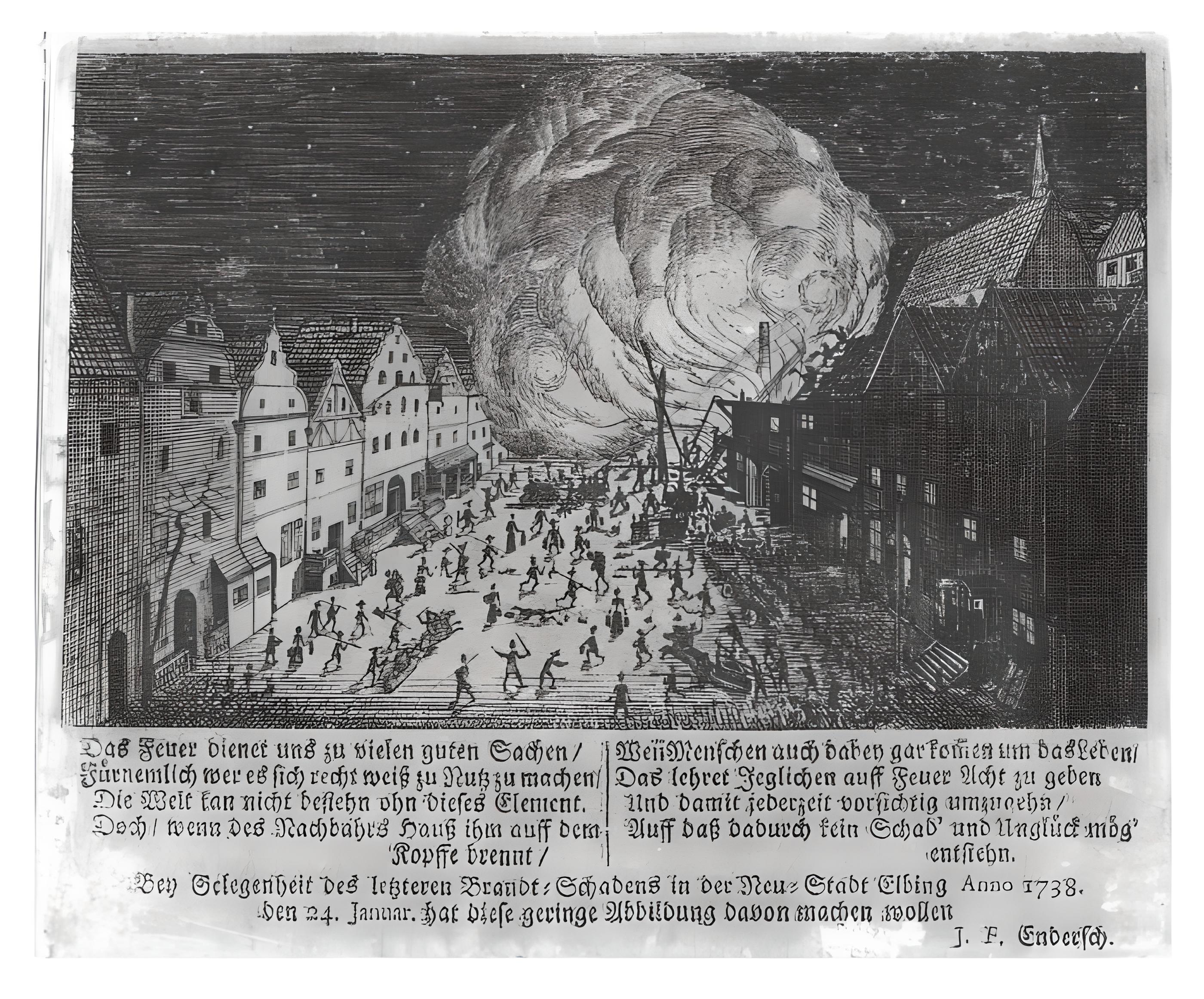 Pożar na Nowym Mieście w Elblągu 1738 r. Autor Fryderyk Endersch. Domena publiczna FBC. Grafika ilustruje tragedię w dawnych czasach wielu miast i wsi spowodowaną klęską pożarów. Wówczas to w wielu aglomeracjach miejskich w ramach tzw. porządków ogniowych, do ochrony przeciwpożarowej zobowiązani byli oczywiście wszyscy mieszkańcy, chociaż ten główny obowiązek spoczywał jednak na rzemieślnikach. Były to czasy, kiedy nie powołano jeszcze straży pożarnych przynajmniej takich o jakich uczymy się z XIX wiecznych zapisów.