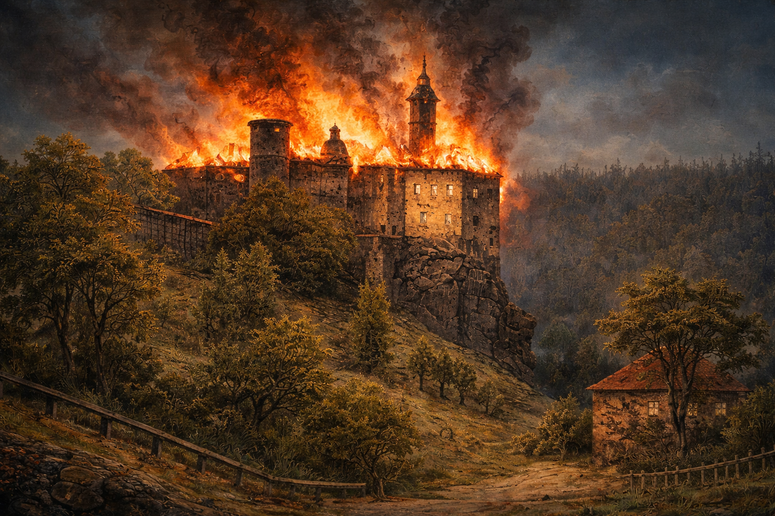 Powyższe fragmenty pochodzą z rękopisu pamiętnika z 1890 r. Franciszka Kostrzewskiego (1826–1911), polskiego malarza i ilustratora. Kostrzewski opisuje w nim dwa pożary zamku w Pieskowej Skale, które wydarzyły się w krótkim odstępie czasu w 1850 i 1853 r. Narracja artysty jest niezwykle cenna z kilku powodów. Autor nie ogranicza się do suchej relacji faktów. Opisuje katastrofę przez pryzmat światła i koloru, wspominając o „grze barw” i wieżach „zarumienionych pożarem”. Nawet w obliczu tragedii reaguje jak malarz. Analizuje wizualną stronę zjawiska, obserwuje zmienność tonów i kontrastów. Relacja o drugim pożarze zawiera kluczowy szczegół dotyczący jego przyczyny, tj. przypadkowego zaprószenia ognia przez blacharzy podczas reperacji dachu. To bezpośrednie wskazanie sprawców nadaje zapiskom rangę wiarygodnego dokumentu epoki. Szczególnie sugestywny jest opis momentu, w którym artysta „z ołówkiem przy wierzchołku” wieży dostrzega pierwsze kłęby dymu. Scena ta ukazuje dramatyzm pracy plenerowej i pozwala przypuszczać, że w tekach malarza mogły znajdować się szkice wykonane na chwilę przed wybuchem ognia.