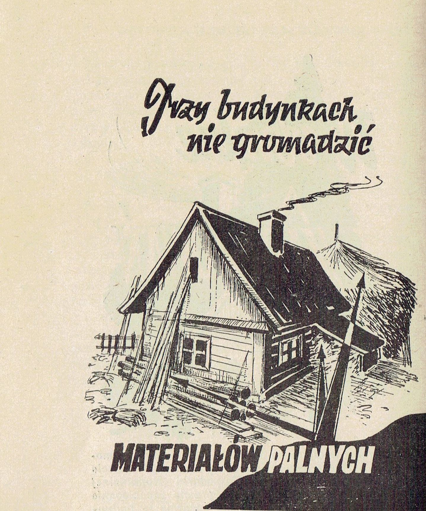 „Nieporządek na podwórzu, gromadzenie chrustu z drewna oraz innych materiałów palnych jak również sprzętu gospodarczego w wielu wypadkach może powiększyć rozmiary pożarów . Nie należy w obrębie zabudowań ustawiać stogów”.