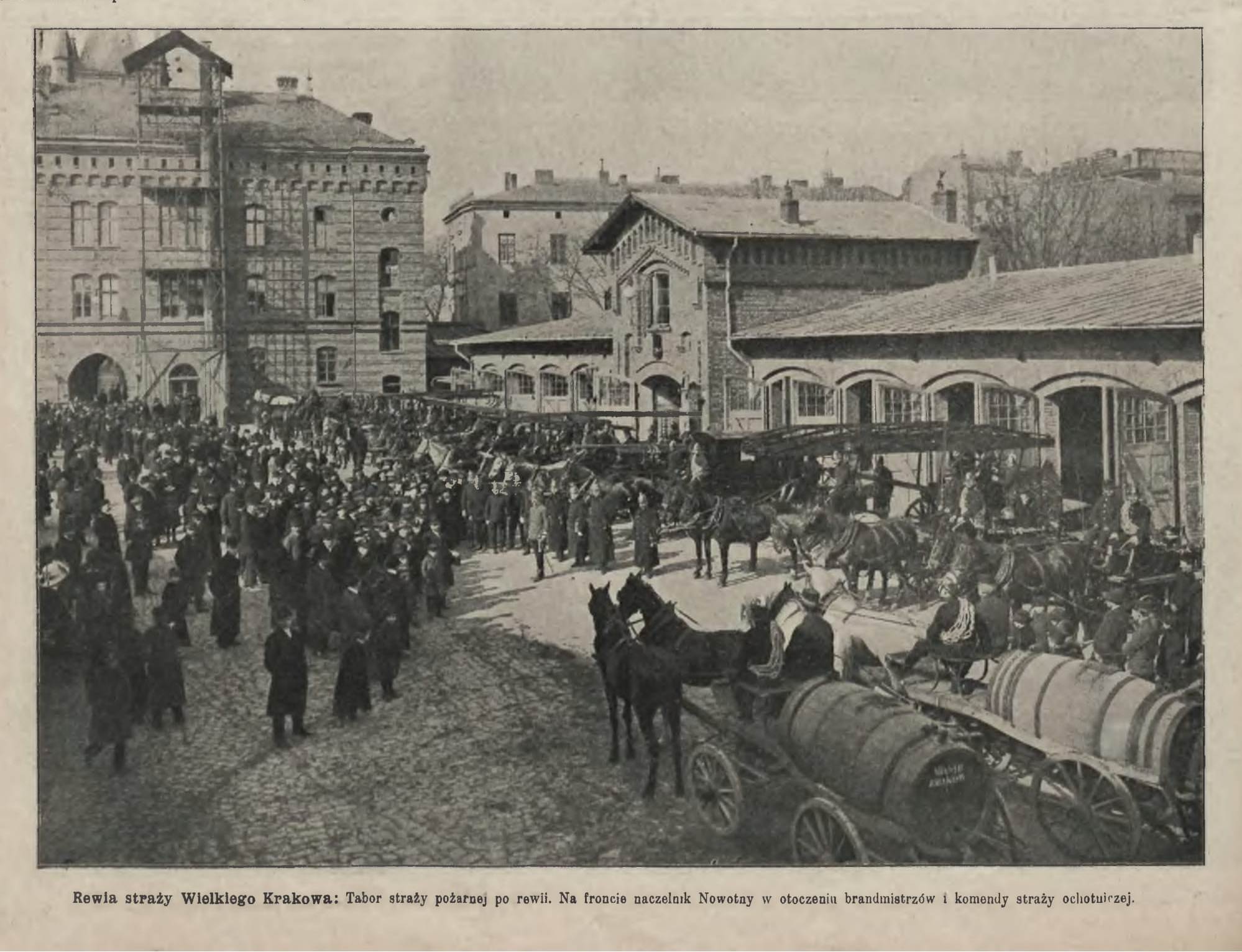 Nawet nie tyle chodzi o to zdjęcie z 1910 r. co o prasowy podpis pod nim: „Rewia straży Wielkiego Krakowa: Tabor straży pożarnej po rewii. Na froncie naczelnik Nowotny w otoczeniu brandmistrzów i komendy straży ochotniczej”. – Nowości Ilustrowane nr 11 z 12 marca 1910. Słowo rewia lub rewja w odniesieniu do widowiskowych pokazów i prezentacji. Z tym słowem chyba najczęściej spotkałam się czytając np. Ilustrowanego Kuriera Codziennego. Wielki Kraków, tak jak i Wielki Lwów, gdzie chodziło o podkreślenie roli miasta – jego gospodarki, infrastruktury, urbanistyki, ale także lub przede wszystkim kultury i nauki. Z określeniem Wielki Kraków i Wielki Lwów spotkacie się czytając chociażby publikacje o charakterze wspomnień. Brandmistrz (młodszy lub starszy), to dawna ranga w straży. Zachęcam przy tej okazji by zapoznać się z biogramem st. brandmistrza z krakowskiej straży Maksymiliana Wałęgowskiego (1843-1887) – powstańca styczniowego zesłanego na Sybir. Nie publikuję o nim zajawki, ponieważ jego życiorys opisany jest już w Internecie. Jeśli historia jego służby i walki w powstaniu Was zainteresuje, to na pewno znajdziecie o nim materiały. Nauczyciele historii i wiedzy o społeczeństwie – tu pytanie do Państwa. Czy nie myśleliście by zadać uczniom przeprowadzenie takiej lub podobnej kwerendy. Zachęcić do samodzielnego myślenia, sposobów szukania, stawiania pytań i odpowiedzi na nie? Spotkajmy się w bibliotece muzeum pożarnictwa. d.j. [CMP]