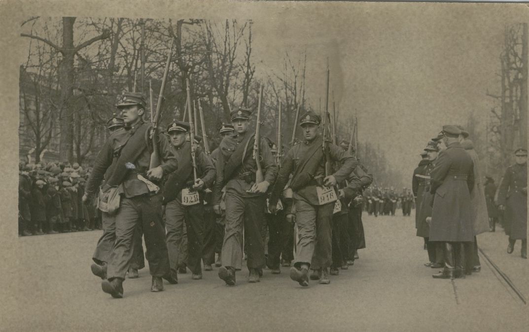 Fotografia w zb. CMP. Marsz Sulejówek - Belweder - drużyna straży pożarnej z Radzynia. Warszawa 19.03. 1932 r. Foto: R. Walter.