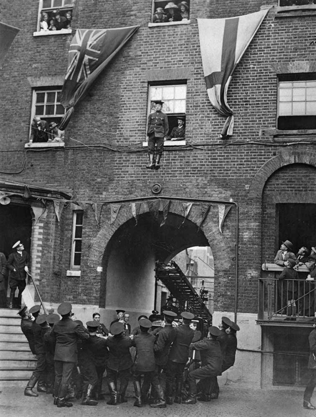 Londyn 1922 r. Ćwiczenia strażaków z użyciem koca ratunkowego in. skokochronu – sprzętu amortyzującego upadek.