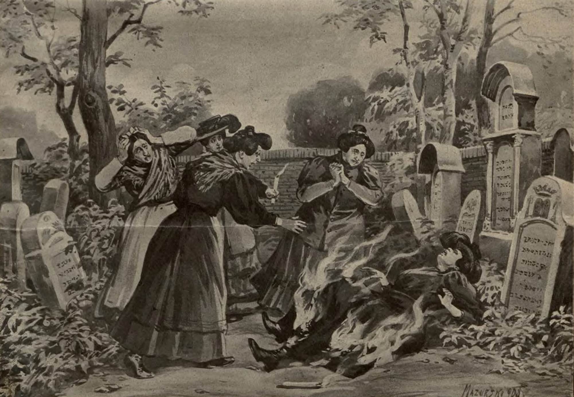 Nie do końca wierzę by historia ta wydarzyła się naprawdę. Jeśli macie ochotę, to przeprowadźcie własne śledztwo w tej sprawie. O prawdziwych i nieprawdziwych wydarzeniach z dawnej prasy możecie przeczytać na blogu w dłuższych artykułach z cyklu Wydarzyło się (nie) naprawdę. Dzisiaj publikuję tę zajawkę ze względu na rycinę i język w jaki ta historia została zrelacjonowana. Myślę, że chodziło o jakąś prowokację, chociaż mogę się mylić. Nowości Ilustrowane z 1908 r. opublikowały anons prasowy o takiej treści: „Ofiarą strasznego wypadku padła przed kilku dniami żona rabina z Lubaczowa, Feiga Schorrowa. Oto w towarzystwie kilku kobiet udała się ona na cmentarz izraelicki w Lubaczowie, aby tam odprawić na grobie zmarłego niedawno członka rodziny rytualne modlitwy. Stosownie do przepisu rytualnego trzymały wszystkie kobiety podczas modlitwy płonące świece w ręku. Spowodowało to straszny wypadek. Mianowicie jedna ze świec wypadła z rąk trzymającej ją kobiety, wskutek czego zajęły się suknie żony rabina. W jednej chwili stanęła nieszczęsna kobieta w morzu płomieni. Mimo niezwłocznego ratunku odniosła ona przy tem tak ciężkie rany i poparzenia, iż w parę godzin potem wyzionęła ducha. Rycina tytułowa w dzisiejszym numerze przedstawia tragiczną chwilę, gdy płomienie obejmują suknie bł. p. Feigi Schorrowej”. Nowości ilustrowane nr 39 z 26 września 1908.