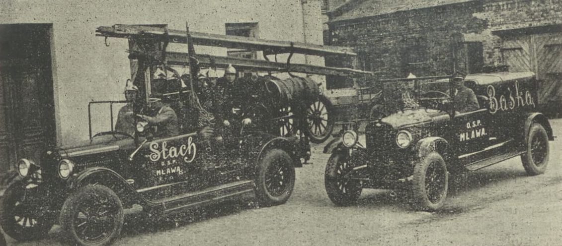 Chevrolety, to chyba najbardziej popularna marka podwozi samochodów w jakie zaopatrywały się polskie straże pożarne międzywojnia. Na zdjęciu Stach i Baśka Ochotniczej Straży Pożarnej z Mławy. Te dwa autopogotowia jak niegdyś określano samochody gaśnicze, mławska straż zakupiła w połowie lat 20. Na dzień 1 stycznia 1934 r. tabor samochodowy tej jednostki składał się z autopogotowia marki Chevrolet, cysterny na 1500 litrów, także marki Chevrolet oraz cysterny marki International na 2200 litrów wody. Na tę chwilę nie posiadam informacji na temat producenta lub producentów zabudowy pożarniczej tych pojazdów. Jeśli posiadacie wiedzę, kto mógł wykonać nadwozia, to dajcie znać. W jednodniówce jubileuszowej 50 lecia tej jednostki (1881-1931) przeczytałam z jakimi problemami borykała się straż odnośnie zabezpieczenia i ochrony samochodów w miejscu. Przytoczę Wam najciekawszy fragment: „Pomieszczenie to jest nieodpowiednie, bowiem bramy tej remizy są niskie i autopogotowie nie może wyjeżdżać bezpośrednio na ulicę, trzeba w razie alarmu cofać tyłem wóz na podwórze, potem zawracać i wyjeżdżać przez ciasną bramę podwórza co bardzo opóźnia wyjazd i grozi nieszczęśliwym wypadkiem, lub uszkodzeniem wozu”.
