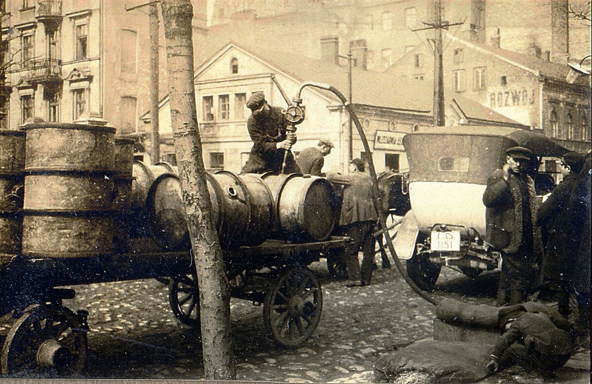 Zdjęcie przedstawia stację benzynową znajdującą się na rogu ulic Kościuszki i Andrzeja Struga w Łodzi. Autorem fotografii datowaną na lata 1926-1927 jest Roman Wajnikoniks. Fotografia znajduje się w zb. Archiwum Państwowego w Łodzi.