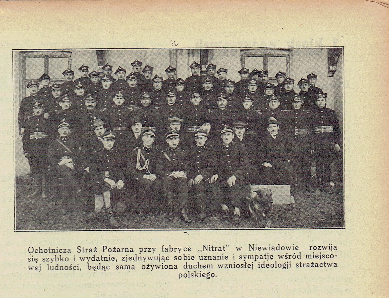 [Inc.:] Ochotnicza Straż Pożarna przy fabryce Nitrat w Niewiadowie rozwija się szybko i wydatnie zjednywując sobie uznanie i sympatię wśród miejscowej ludności będąc sama ożywiona duchem wzniosłej ideologii strażactwa polskiego.