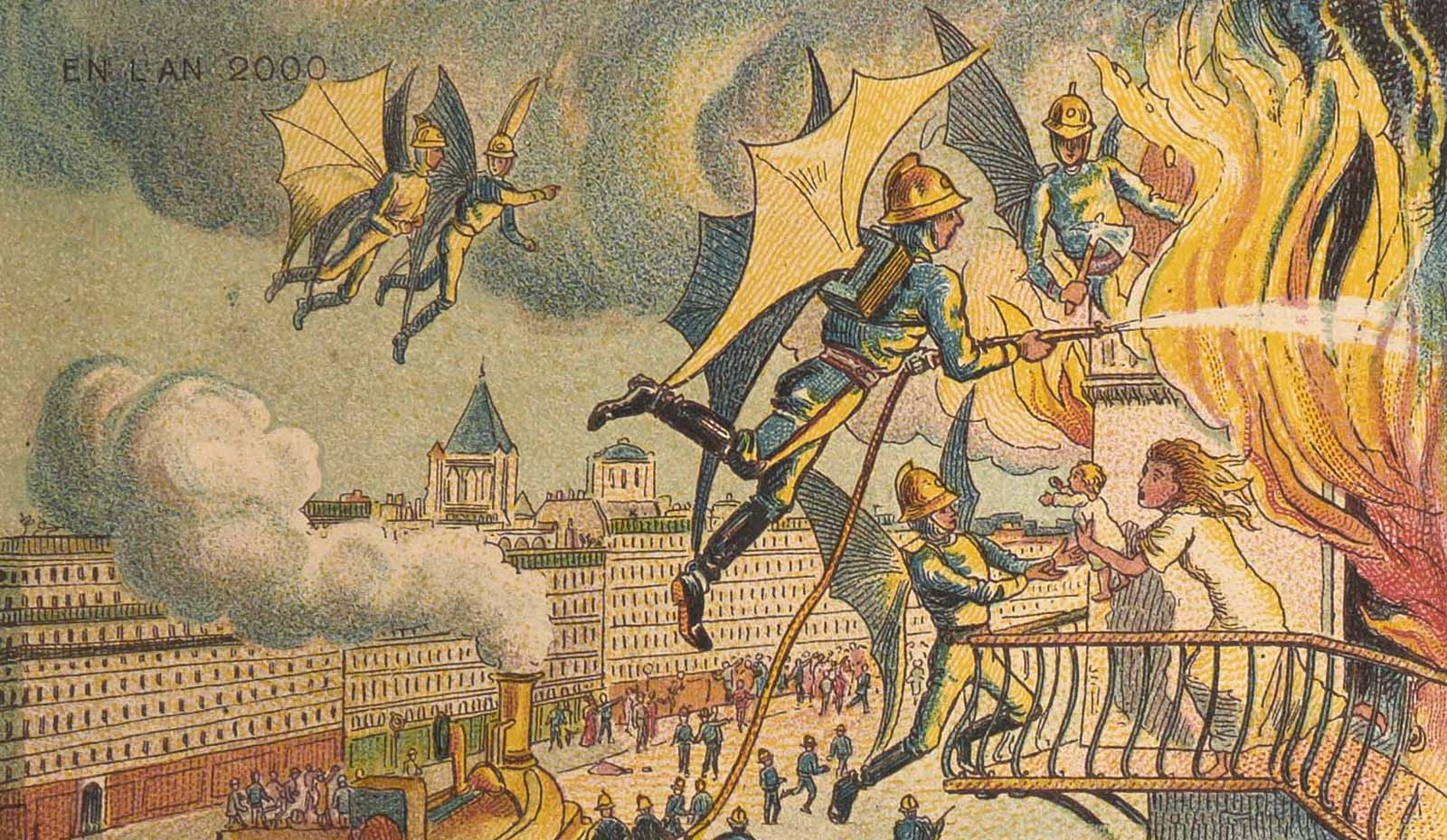 Na załączonym obrazku dostrzec można fruwających strażaków. Taka oto artystyczna wizja przyszłości i postępu techniki. Obrazki z tej serii można było spotkać na pudełkach np. od cygar i czekoladkach. Były wydawane także jako pocztówki. O pocztówkach z motywami strażackimi opublikuję Wam jeszcze niejedną zajawkę lub nawet artykuł. Ten i pozostałe obrazy francuskich XIX wiecznych ilustratorów możecie zobaczyć na wielu stronach domeny internetowej.
