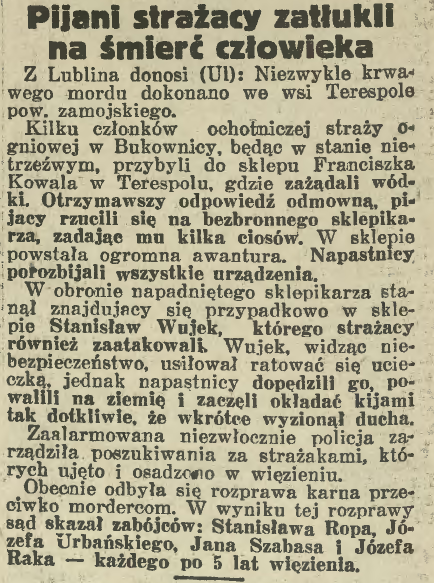 To trzeci post blogowy z cyklu true crime, który treścią nawiązuje do zajawek: „Strażak morduje wystrzałem z rewolweru” i „Strażak podpalaczem”. Dzisiaj przypomnę równie niechlubną historię. W 1934 r. w Terespolu czterech strażaków aresztowano. Zostali oni oskarżeni o zabójstwo. Skazano ich na 5 lat więzienia. Zabójcy służyli w ochotniczej straży pożarnej w Bukownicy ( w lubelskim).