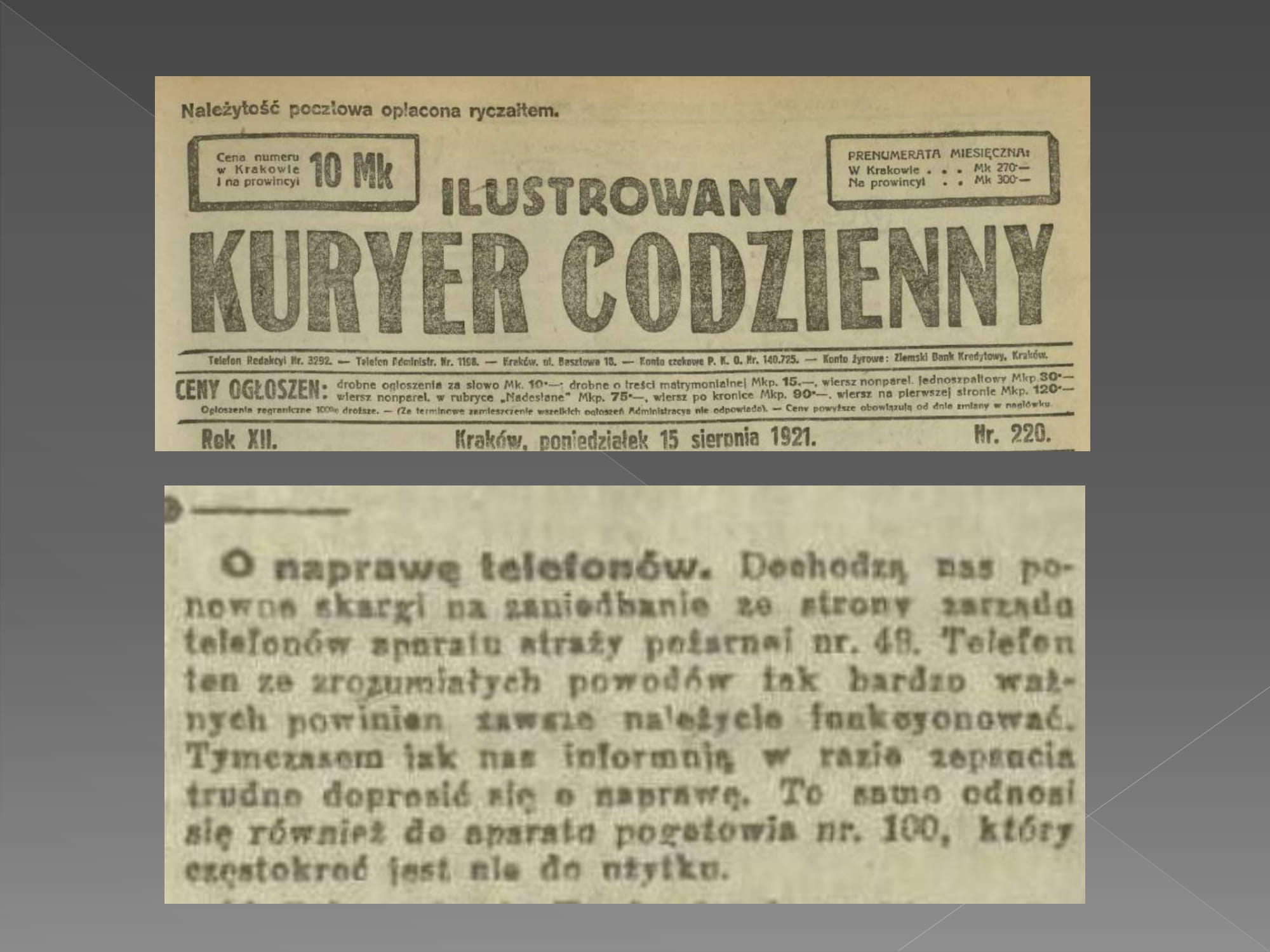 „Dochodzą do nas pewne skargi na zaniedbanie ze strony zarządu telefonów aparatu straży pożarnej nr 49. Telefon ten ze zrozumiałych powodów tak bardzo ważnych powinien zawsze należycie funkcjonować. Tymczasem jak nas informują w razie zepsucia trudno doprosić się o naprawę”.