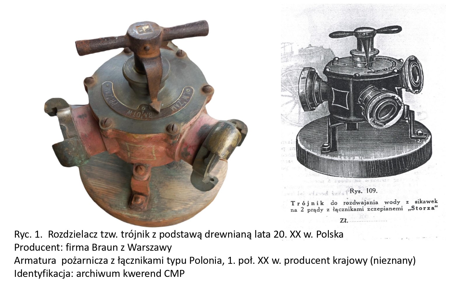 Nie posiadam wszystkich katalogów tej firmy. Pamiętajmy też, że były one wymienne i jeżeli tylko pasowały, to mogły być różnych typów, różnych producentów i mogły być wyprodukowane w różnym okresie. W zbiorach Centralnego Muzeum Pożarnictwa jest bardzo podobny rozdzielacz firmy Strażak z Warszawy także z podstawą drewnianą. Inne tego typu z lat 30. XX w. w zbiorach CMP, posiadają podstawy metalowe (mosiężne).