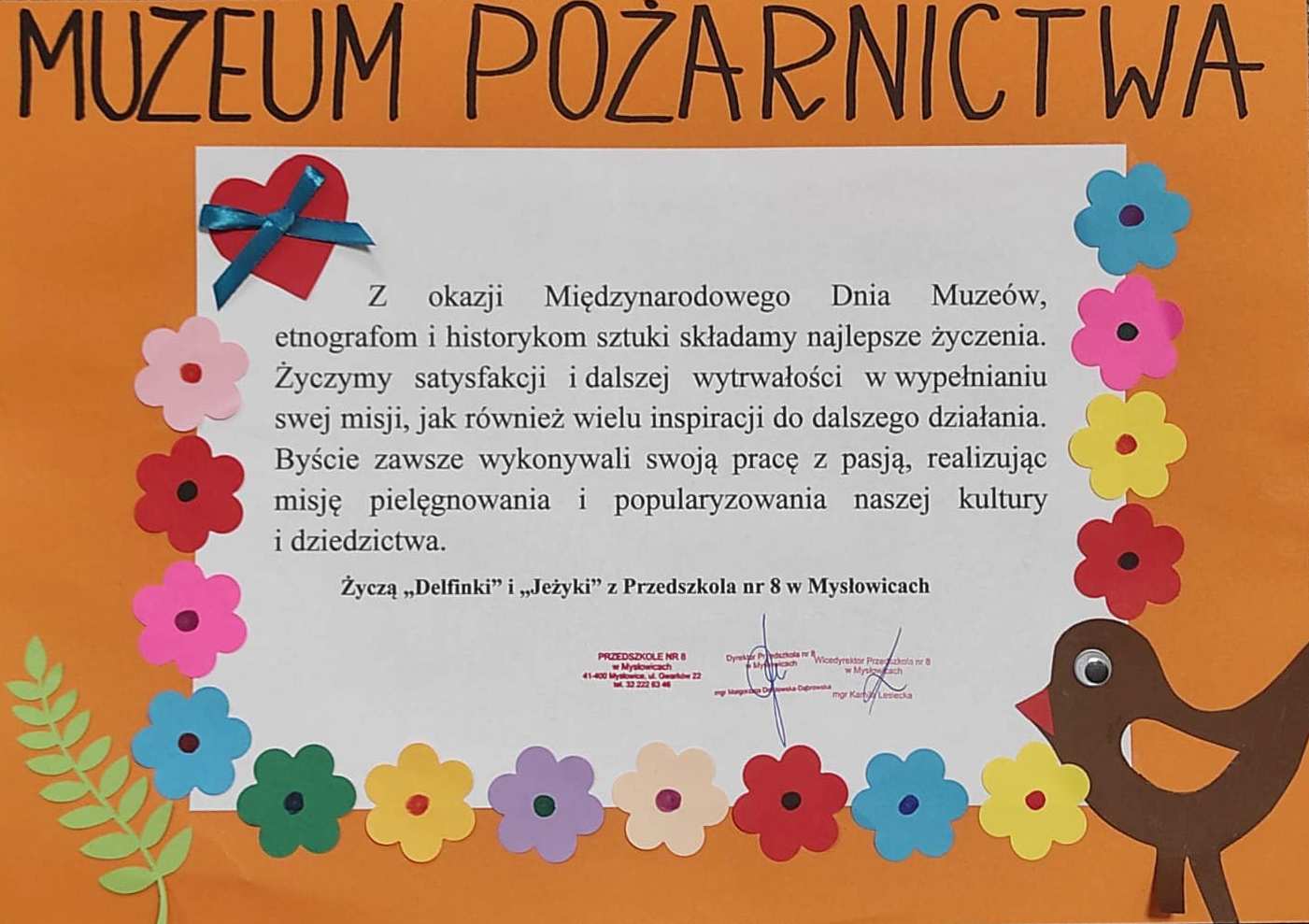 Delfinki i Jeżyki z mysłowickiego przedszkola sprawiły piękną laurkę z okazji Dnia Muzealnika. Byłam świadkiem ich życzeń i naprawdę było to bardzo wzruszające. Przed zwiedzaniem muzeum chwilę rozmawialiśmy z dziećmi. Pani pytała, czy wiedzą gdzie się znajdują, w jakim miejscu? One zaś odpowiadały, że tak w muzeum strażackim i muzeum pożarowym.