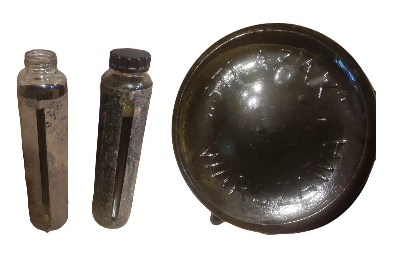Karta w multimediach (zobacz i powiększ obraz) przedstawia dwa wkłady do gaśnicy pianowej z lat 30. XX w. krajowego producenta sprzętu ochrony przeciwpożarowej tj. Fabryki Narzędzi Pożarniczych Strażak z Warszawy. Podstawa ww. przedmiotów (widoczna) sygnowana „STRAŻAK WARSZAWA”.