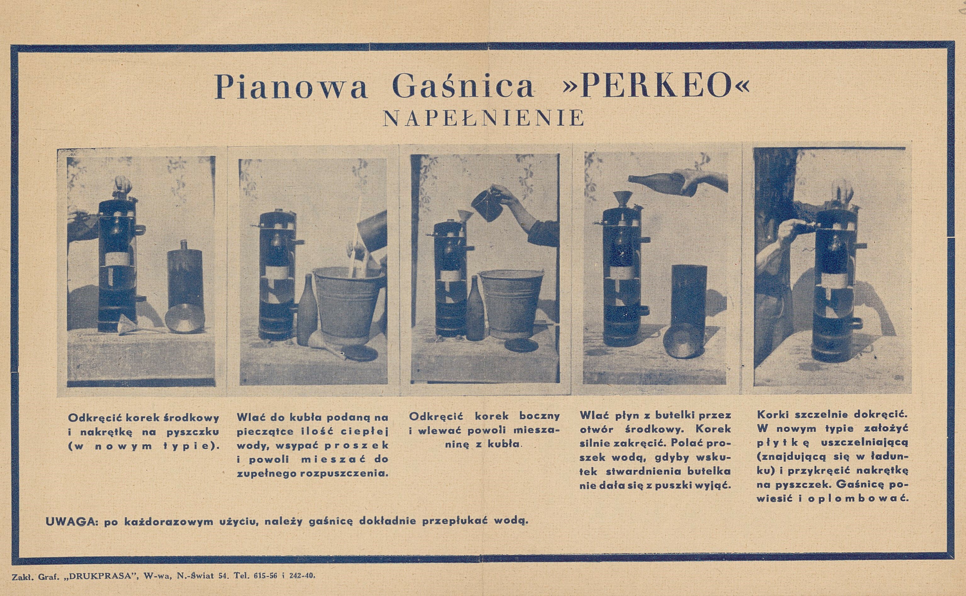 Dziękuję Panu Grzegorzowi z grupy mediów społecznościowych za sporządzenie dokumentacji zdjęciowej, dzięki której mogłam opublikować informację na ten temat. Chciałabym jeszcze dodać, że szklane i okute blachą wkłady wraz z korkiem wysokie były na ponad 30 cm. Średnica ich podstawy wynosiła ok. 5-7 cm. Pojemniki ze środkiem gaśniczym mocowane były wewnątrz pionowo-cylindrycznej obudowy gaśnicy. Dla zobrazowania zobacz przykładową rycinę. Jest to instrukcja indywidualnego napełniania gaśnicy. Powiększ obraz i zobacz jej przekrój, a dostrzeżesz podobne szklane wkłady. Fabryka Narzędzi Pożarniczych Strażak z Warszawy produkowała gaśnice kompletne różnego typu jak również pojedyncze wkłady do wielokrotnego użytku. Przypuszczam, że mogły one pasować także do systemów podobnych gaśnic innych firm. Czynność napełniania tego typów aparatów mógł wykonać każdy, nawet w warunkach domowych.
